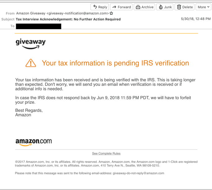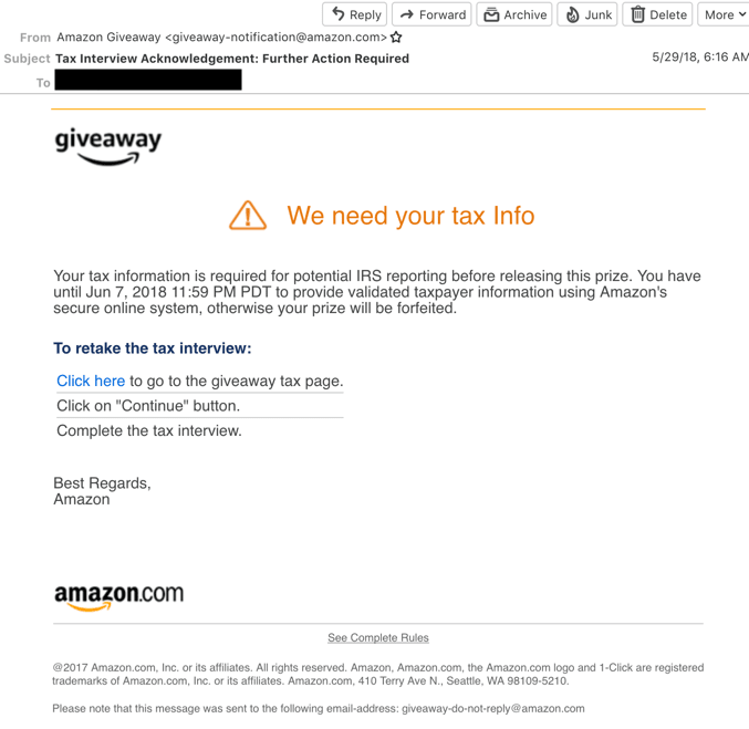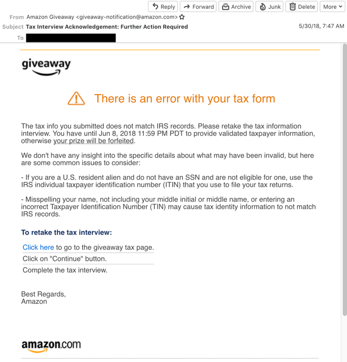 @capguncowboy @unksol Yes. If I didn’t fill out that form, I would have forfeited the last prize and probably wouldn’t have to pay taxes on the previous winnings. But I won 223 of the 261 prizes after receiving the email and would have forfeited those as well. The dollar amount that would be forfeit is $3,820.40.