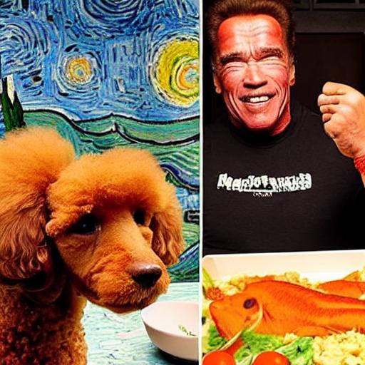 /showme Arnold Schwarzenegger making dinner for a poodle and a goldfish that is completely vegan in the style of Van Gogh