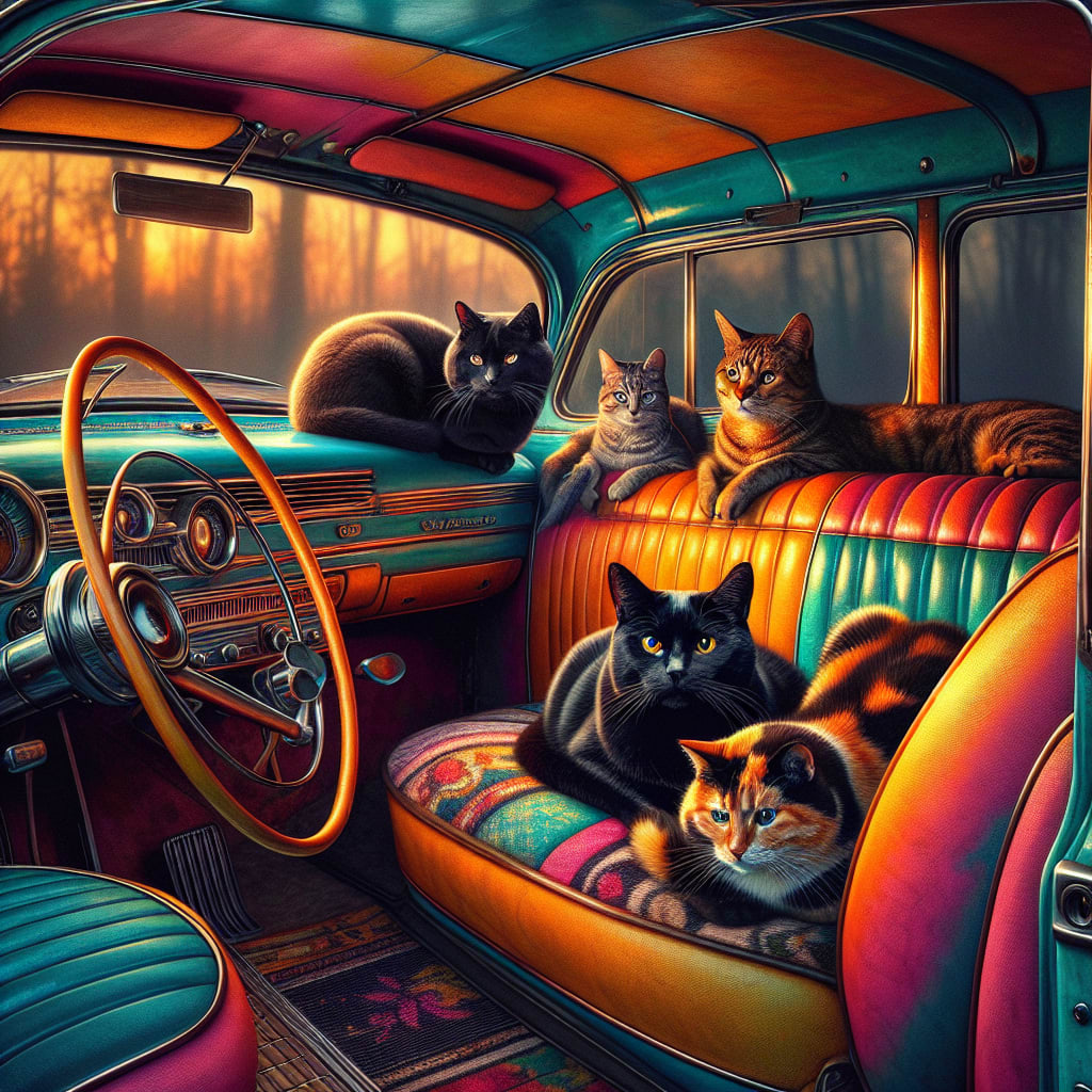 I drove around 2300 miles one way with my cats in a very large metal dog crate where I put in a shelf some years ago. Had a kid in there too. Are we there yet? Meow. That took 4.5 days (so they were in there both directions) in that crate. Here is a photo from the recent trip with all 4 on the shelf (hard to see all 4 - orange in the back is the clue to #4; the string is left over from when one was a kitten in the earlier long trip, would turn her head sideways, slip through the bars and escape. Never got around to removing it all). Also some photos with 3 of the 4 up there. Had take them this time as the person I trade cat sitting with moved and haven’t found someone else where I can take them to their house (not allowed to leave them here and have someone enter my apartment to feed them. That sucks as they’d be happier with that.).