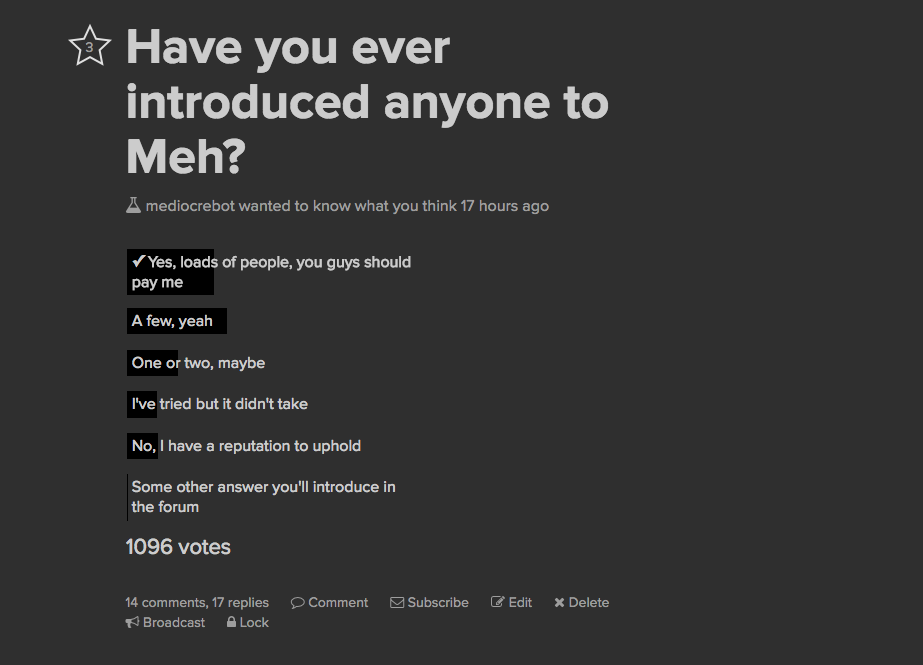 Voted for “reputation”, but really I have none. In fact, I have no friends to invite to Meh. Where is my option of “I have no friends”?
