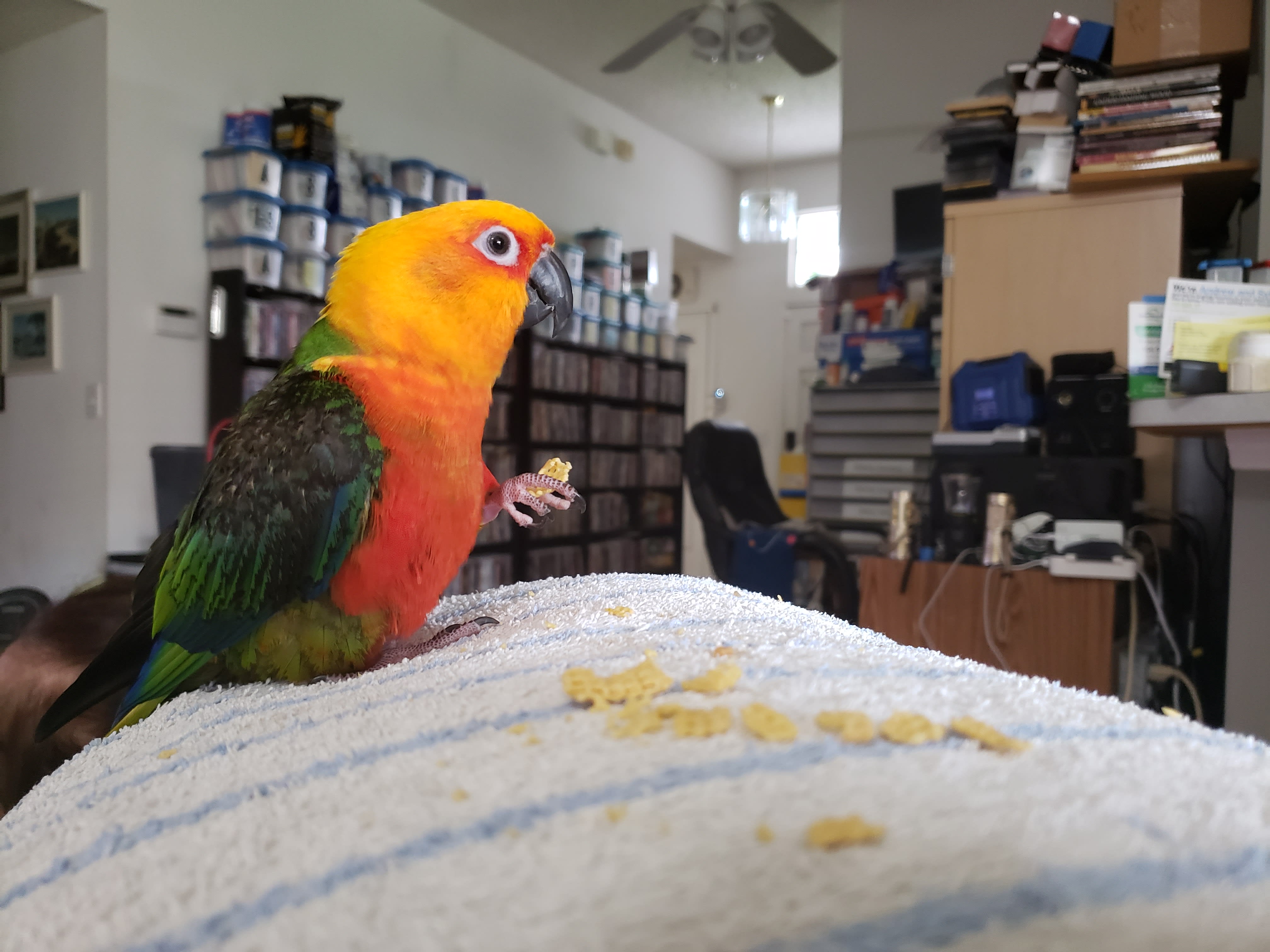 His name is Emerald but doesn’t answer to it at all. He likes eating Honey Nut Chex and likes to bite and scream at visitors. He’s scared of hawks and loud noises. He loves baths and will take a bath multiple times a day. Eats peanut butter, bananas, dried papaya, corn chips, and drinks fruit smoothies.