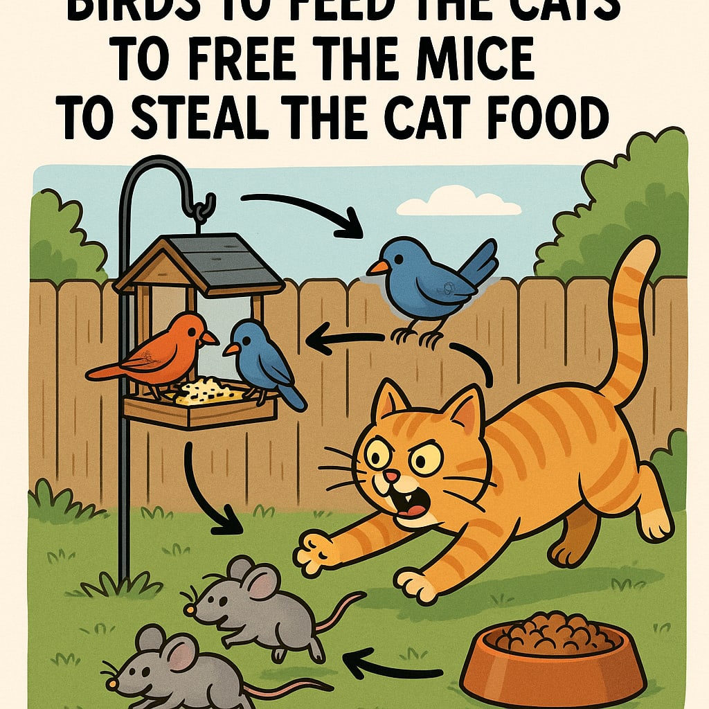 attract the birds to feed the cats to free the mice to steal the cat food to fill my toolbox to remind me yo set the traps. Sold!!