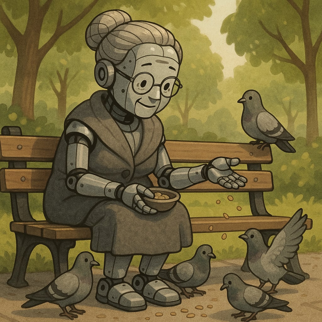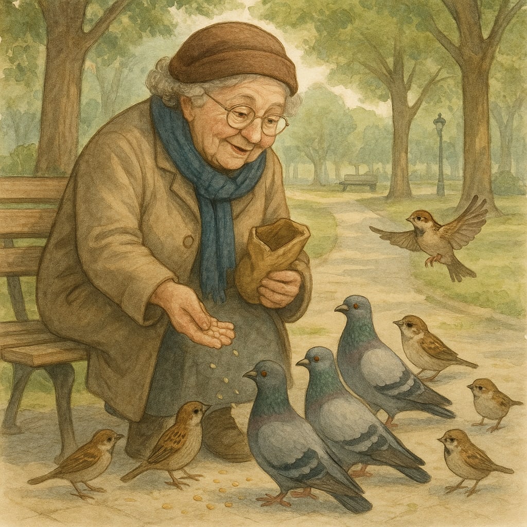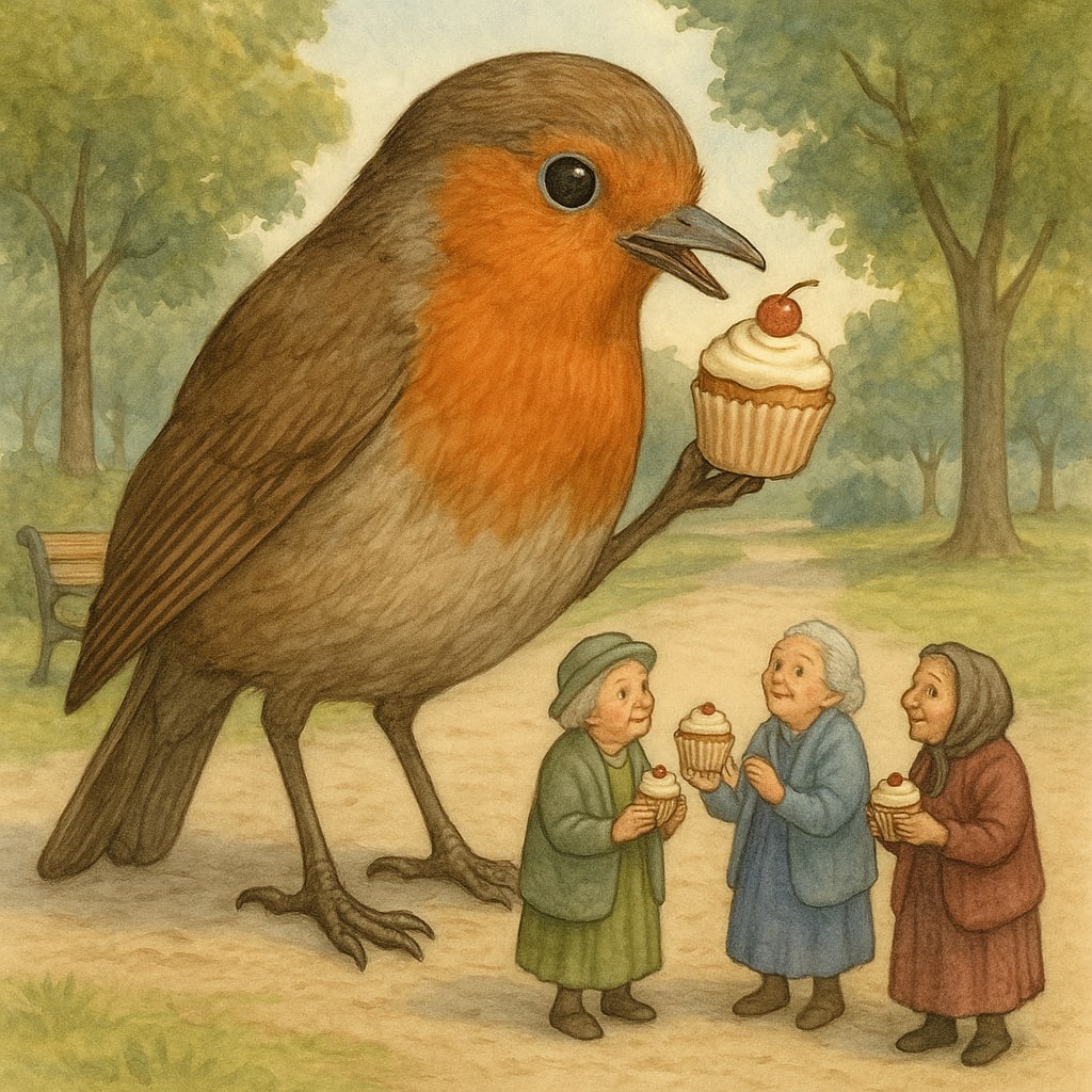 /showme human size bird feeding cupcakes to 10 inch tall little old ladies in a park.