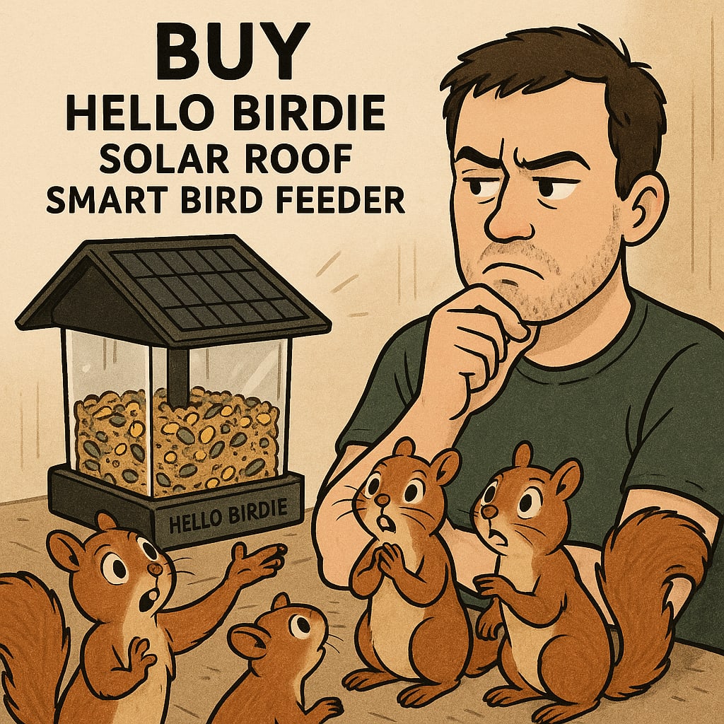 /showme squirrels begging skeptical human to buy Hello Birdie Solar Roof Smart Bird Feeder