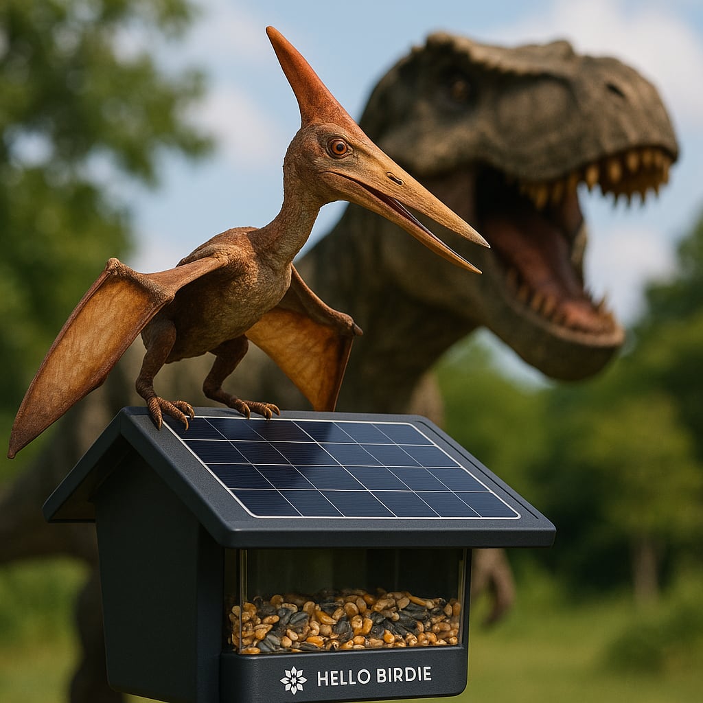/showme Pterodactyl on a Hello Birdie Solar Roof Smart Bird Feeder with a Tyrannosaurus Rex in the background