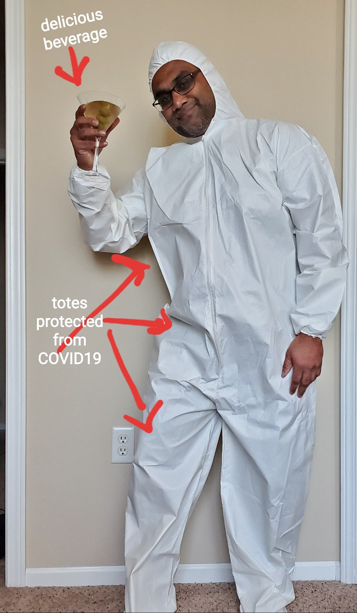 the suit - my company (medical software) got it for me and a couple other people many years ago for a customer event. me and two of the developers were going to show our new software and pretend to be lab workers. but… after wearing the suit for about 20 minutes, it got hot as fuck, so we took them off. i took mine home, never knowing that i would finally find a use for it.