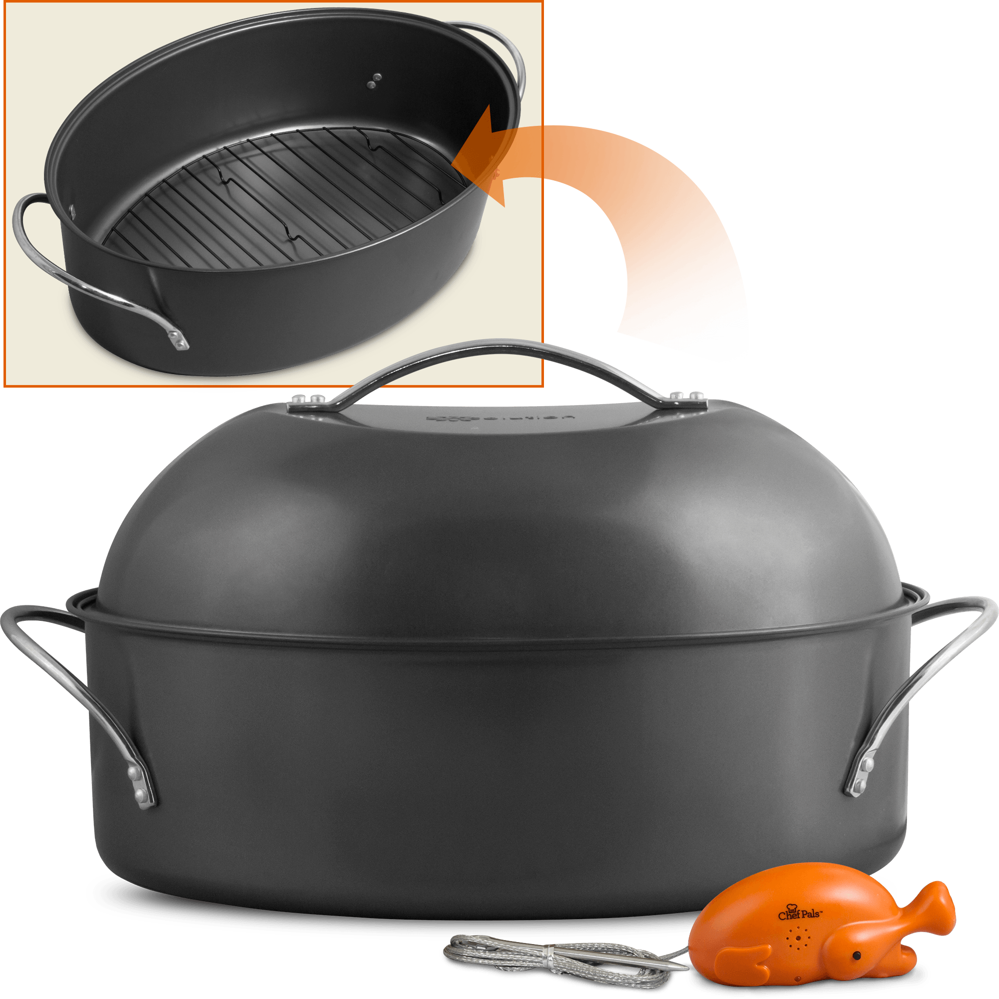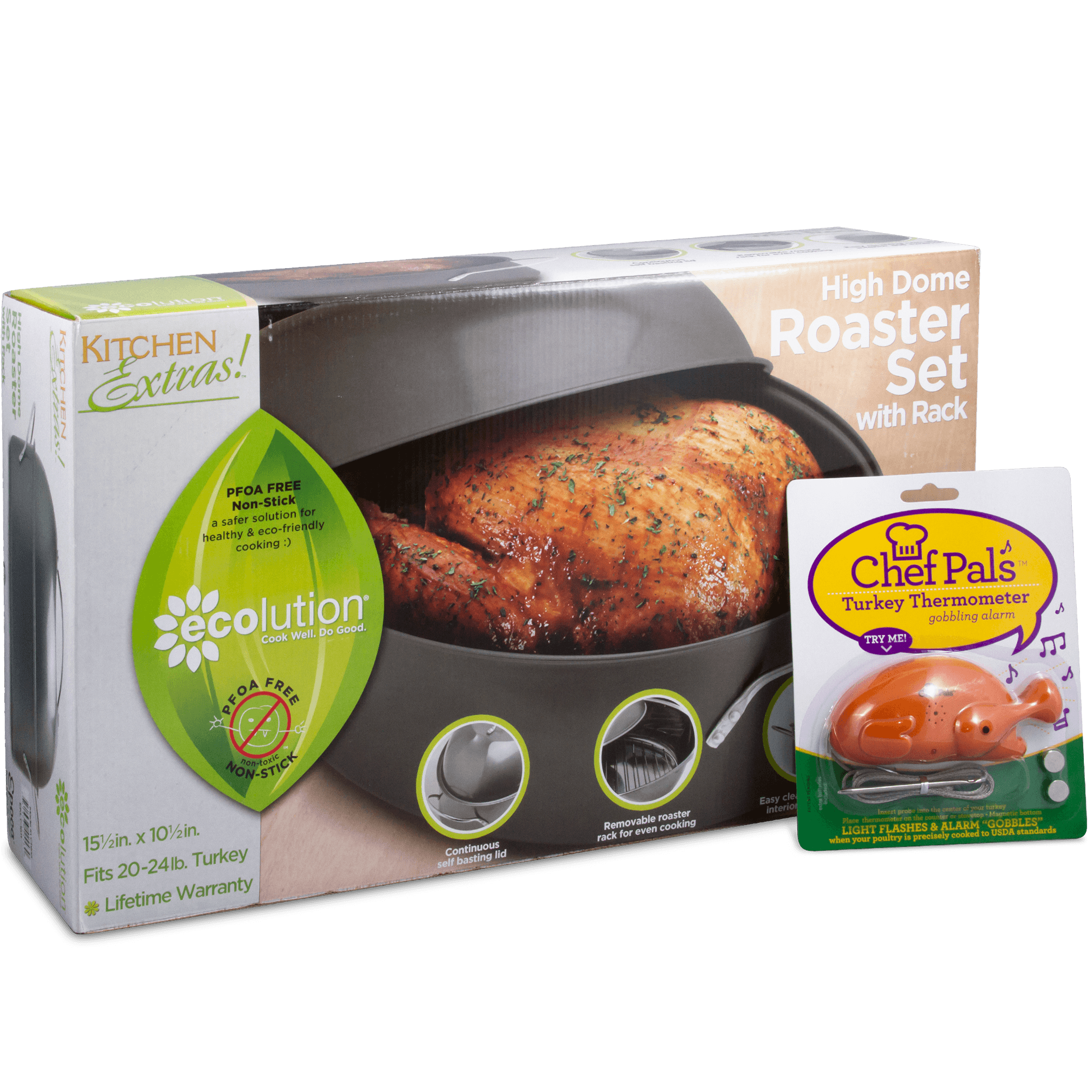 Specs====#### Ecolution Roaster- Continuous self-basting lid- Removable rack- Holds up to 24lb turkey- Riveted metal handles for added strength- Ecologically advanced water based non-stick coating is PFOA free- Dishwasher safe- Oven safe up to 450 degrees#### Thermometer- Alarm “Gobbles” with flashing lights when poultry reaches USDA standard temperature- Includes 4x L1154F batteries- Probe goes in bird, thermometer stays on counter- Magnetic bottom- No warrantyConditon - New Warranty - Lifetime - Epoca (Roaster Pan)Ships Via - FedEx SmartPost - $5 Shipping, Free with VMP What’s in the Box?!====- Roaster Pan with Lid and Rack- Turkey ThermometerPictures====RoasterPackagingPrice Check====$42 at Amazon