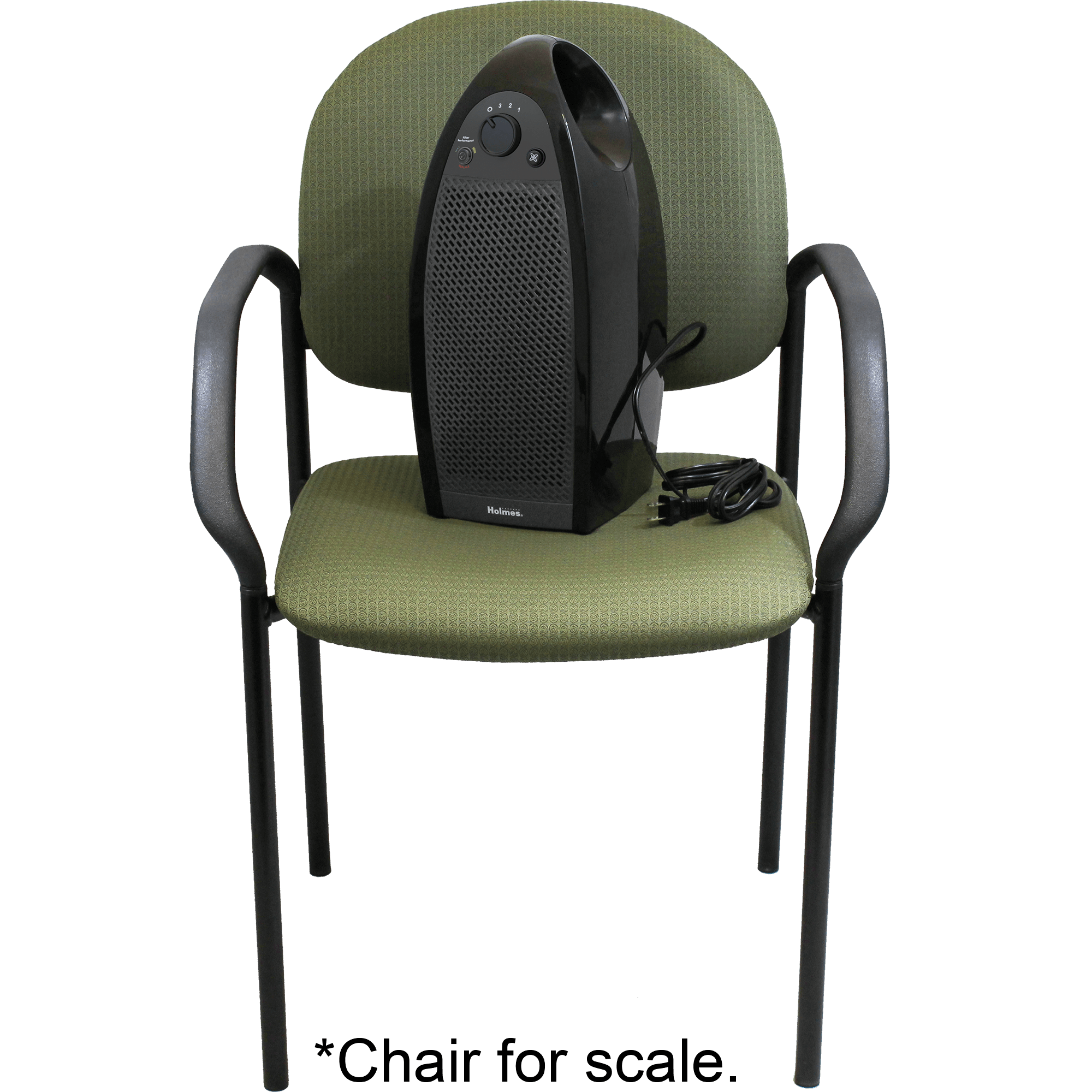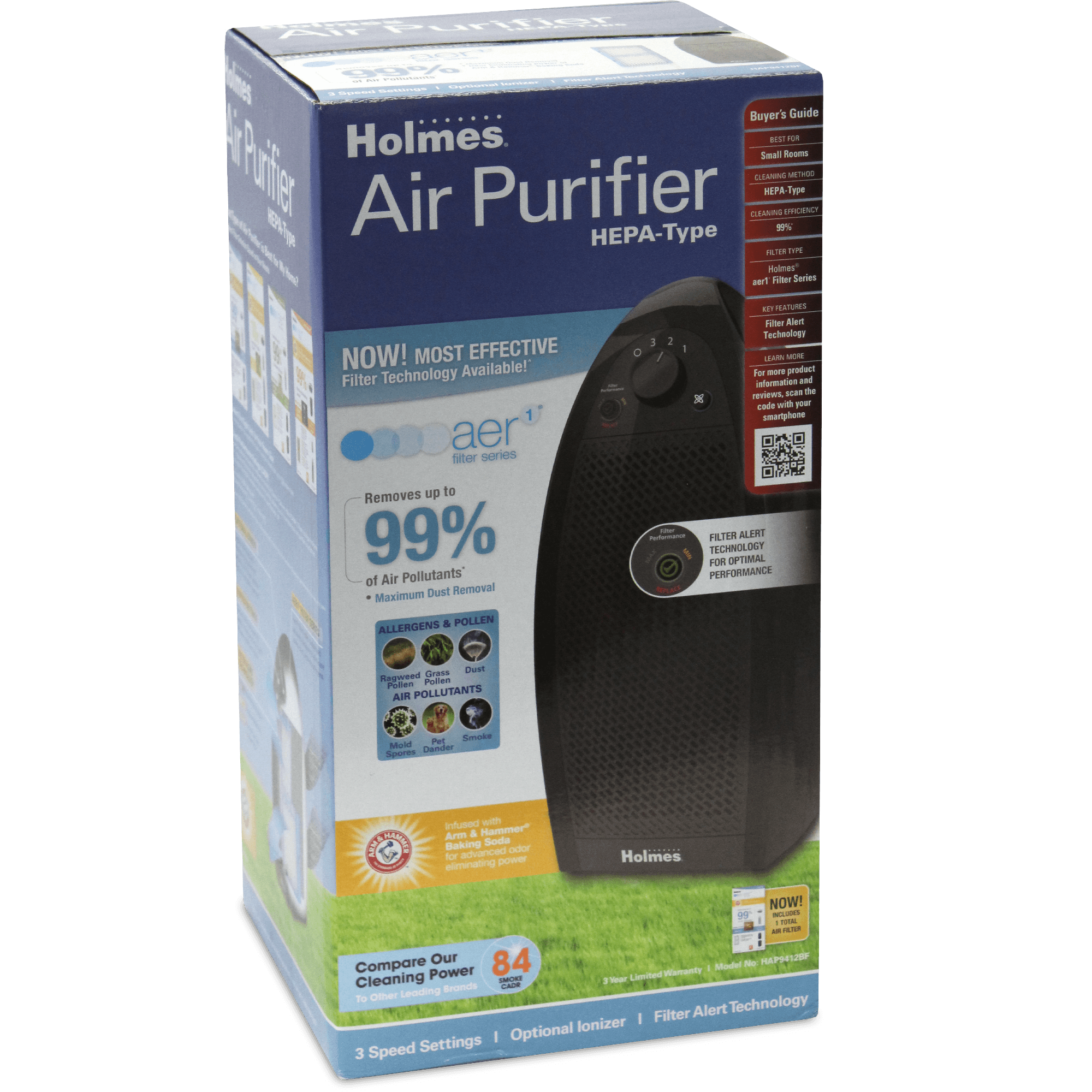 Specs ====- Model: HAP9412BF-TUA- HEPA-type filter helps remove up to 99% of airborne particles with Arm & Hammer baking soda to assist in odor elimination- Optional ionizer for particle removal- 3 speed settings- Alerts user when filter needs changing- Recommended for rooms up to 110 sq ft or 10ft x 11ft- Compatible with AER1 Series filters, HAPF30D-U2 HEPA-Type filter, or Holmes HAPF300D-U2 True HEPA filter- Dimensions: 8.5 x 17.75 x 9 in- Weight: 6.6 lbs- CADR: Tobacco and smoke: 84 / Dust: 81.4 / Pollen: 80.2Condition: New Warranty:3 Year HolmesEstimated Delivery: 4/29 - 5/1Shipping: $5 or free with VMP What’s in the Box?====1x Air purifier1x AER1 Total Air HEPA type filterPictures ====3/4 viewSide viewHow filters workThe included filterBox shotChair for scaleHolmesPrice Check====$49.99 at Amazon$81.99 List