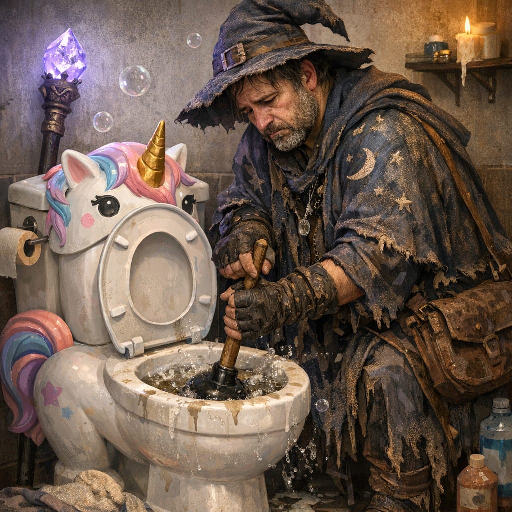 @zippyus Here’s the image you requested for “dejected mage unclogging a unicorn toilet”
