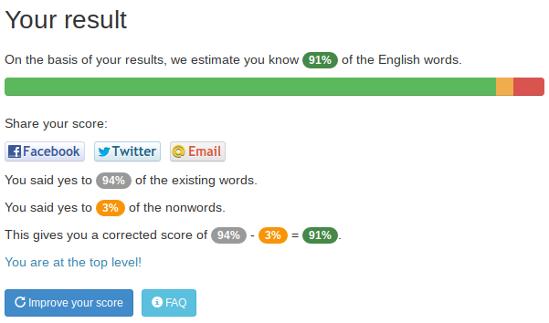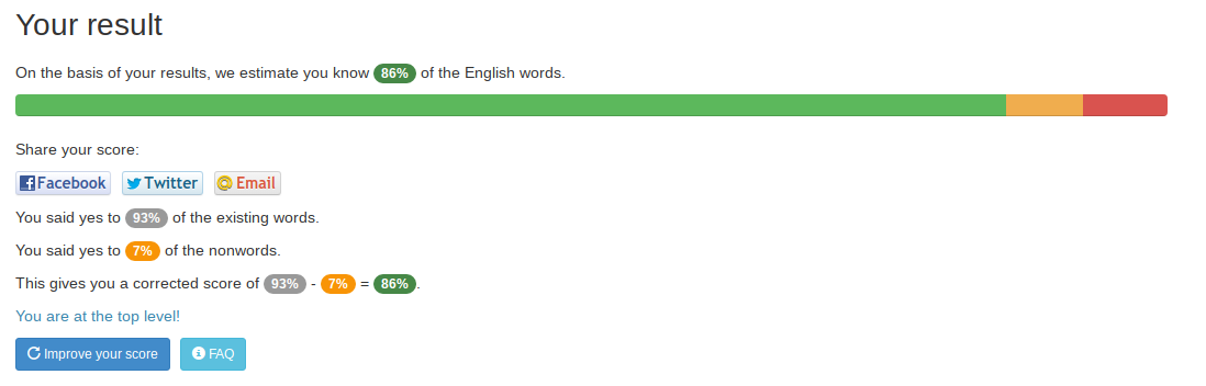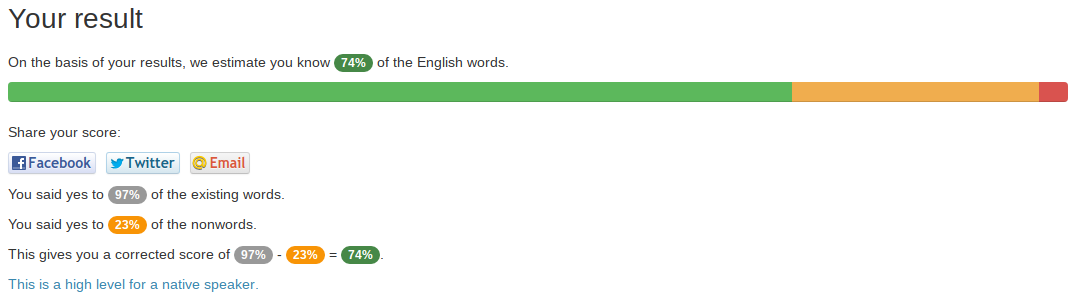 It says this is high level for a native speaker… Meanwhile, I normally think my vocabulary is terrible. I don’t use “big words”. I guess it’s not as bad as I thought compared to the average?