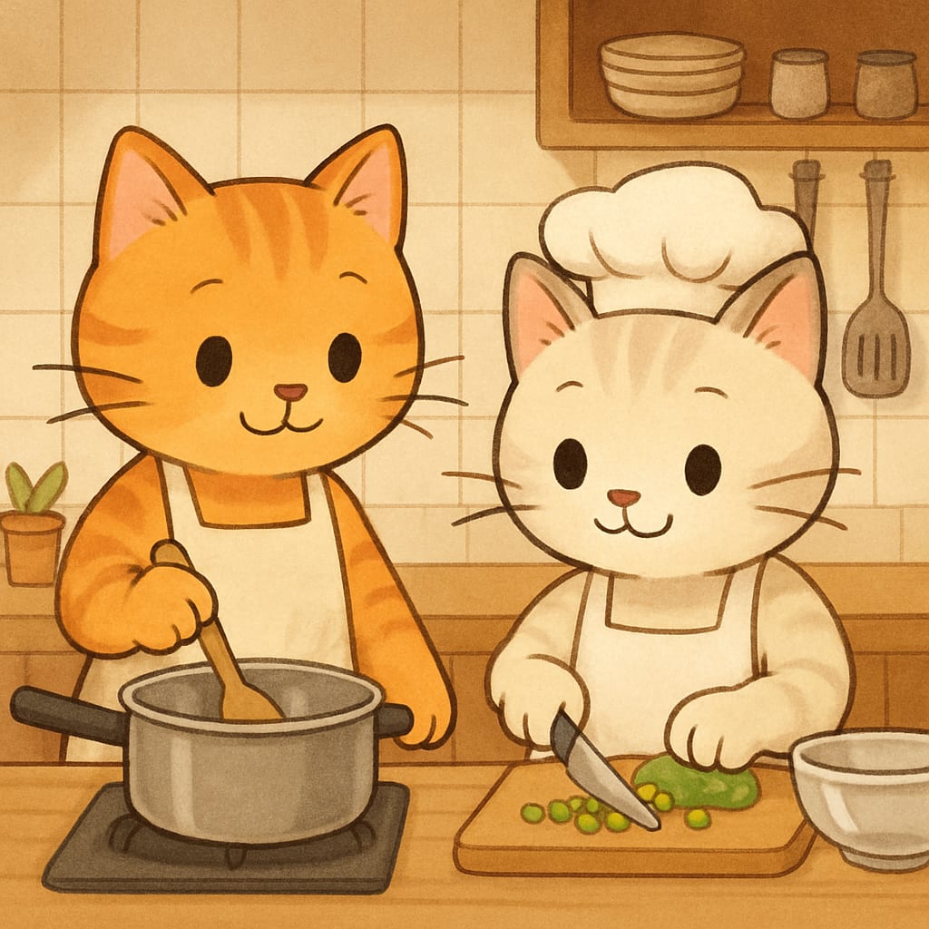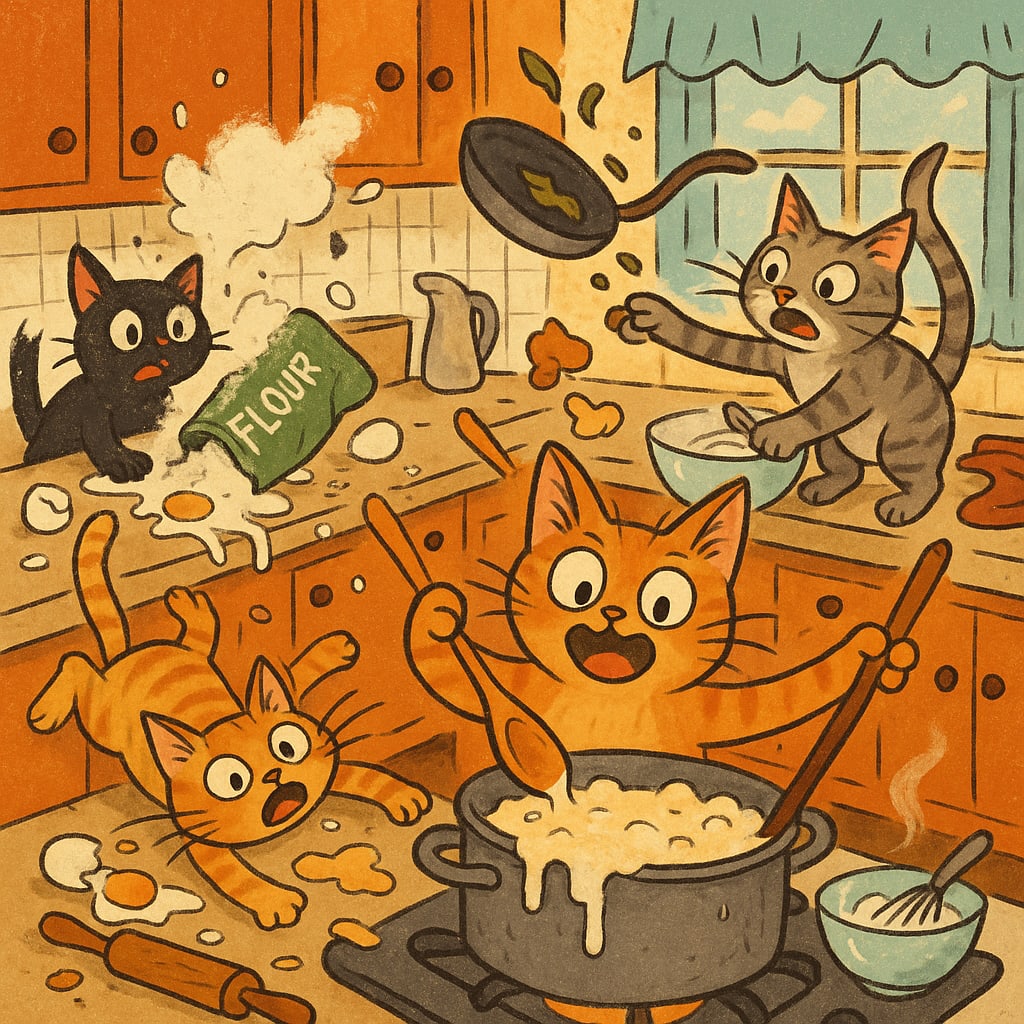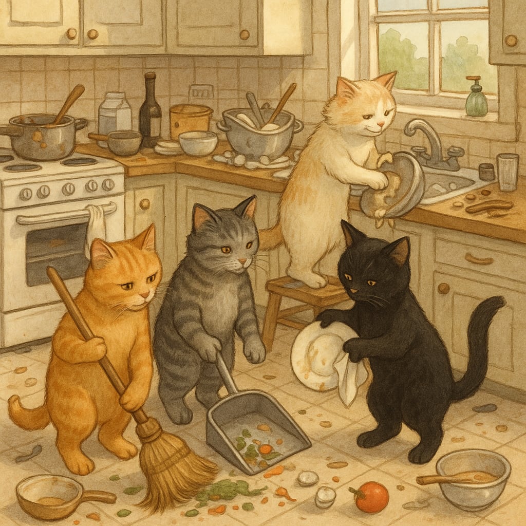 /showme cats cleaning up a messy kitchen after a day of cooking