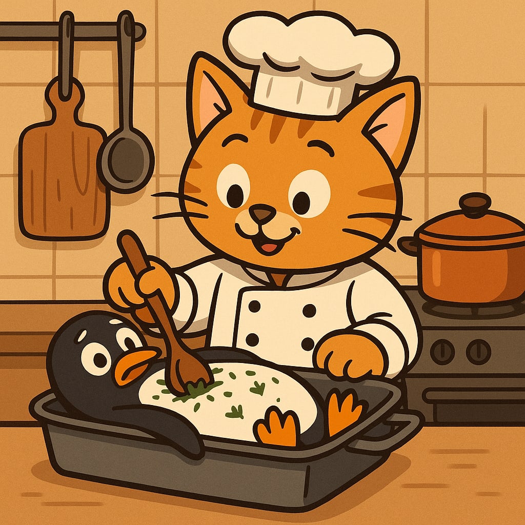 moreless questionable AI pics …/showme a cartoon cat chef preparing a penguin in a roasting pan