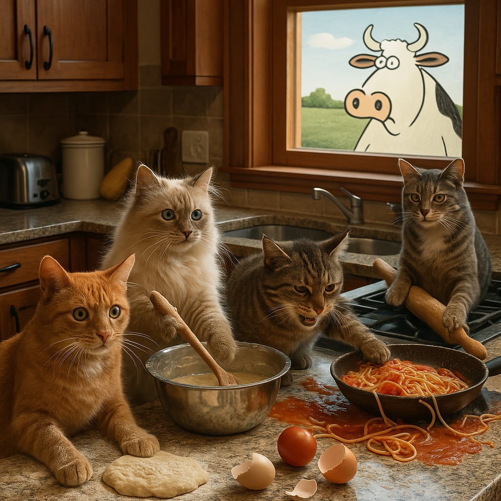 /showme photorealistic cats making a mess while cooking in a robust home kitchen plus the cats cannot have human thumbs or hold the tools as if they had thumbs. All while a cow drawn in the style of Far Side is outside looking in from the window.