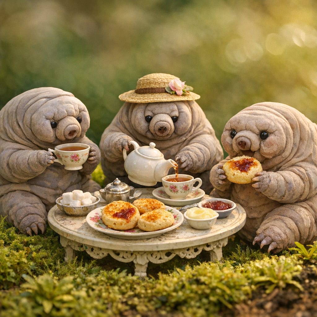 @cfg83 Here’s the image you requested for “tardigrade and water bear and moss piglet having tea and crumpets.”