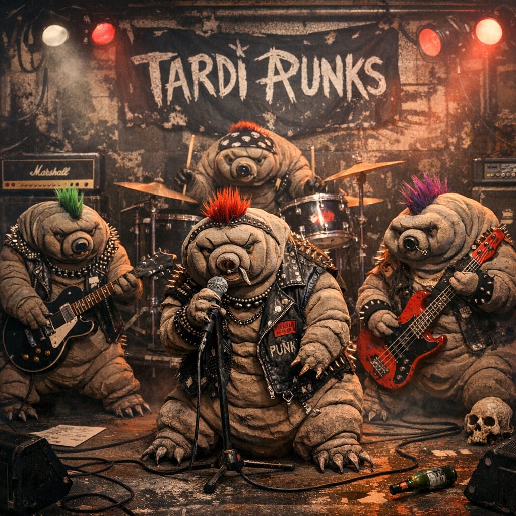 @cfg83 Here’s the image you requested for “Tardigrades in punk rock band.”