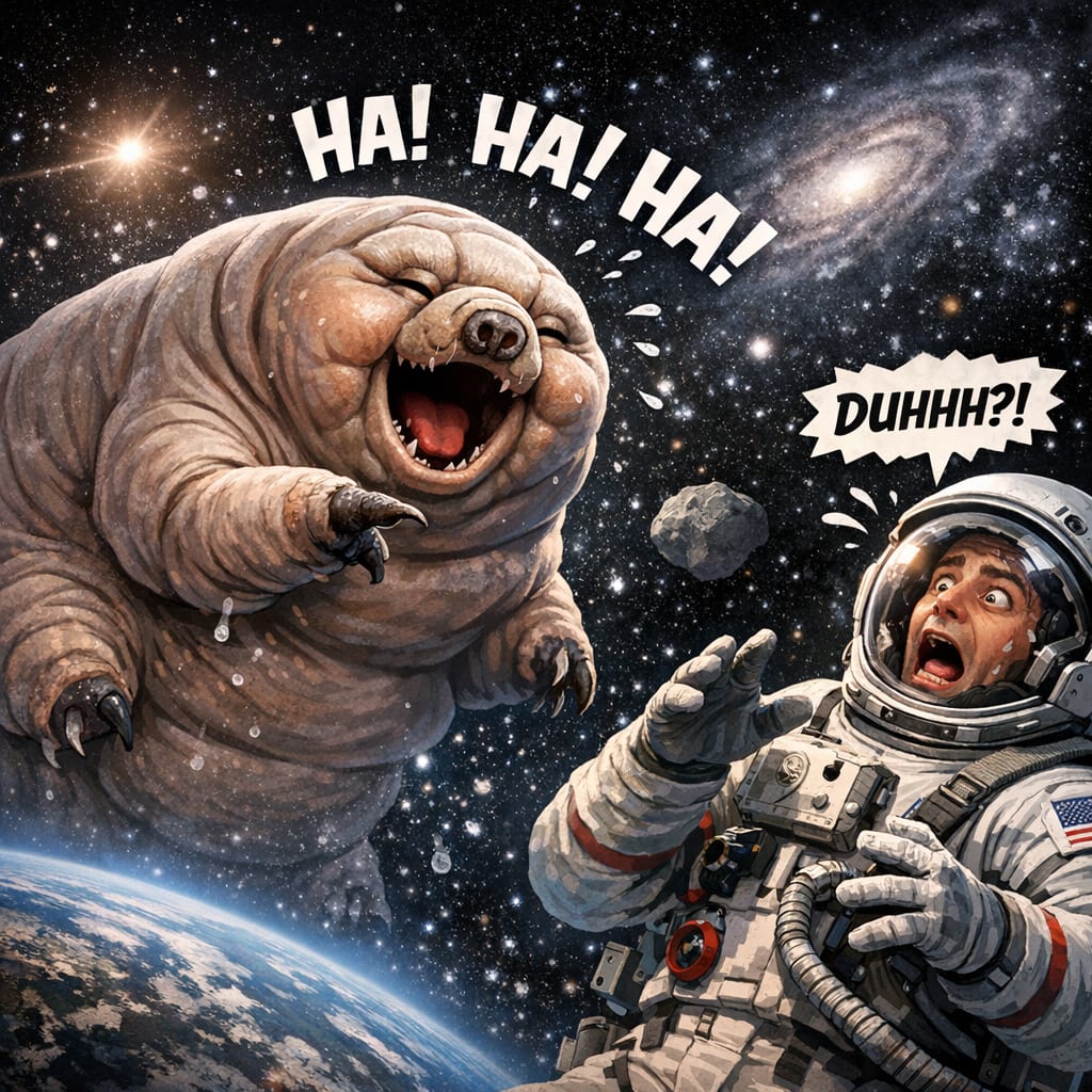 @cfg83 Here’s the image you requested for “Tardigrade in outer space is laughing at dumb human in space suit.”