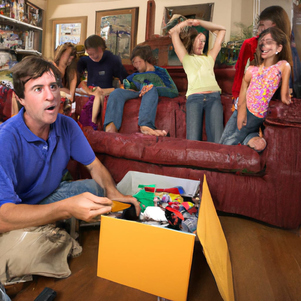 /showme guy absolutely thrilled looking at a box of junk for which he overpaid. His family is behind him looking disappointed. The wife is considering divorce. The kids think Mom’s new friend Greg is really cool. In a middle class suburban home.