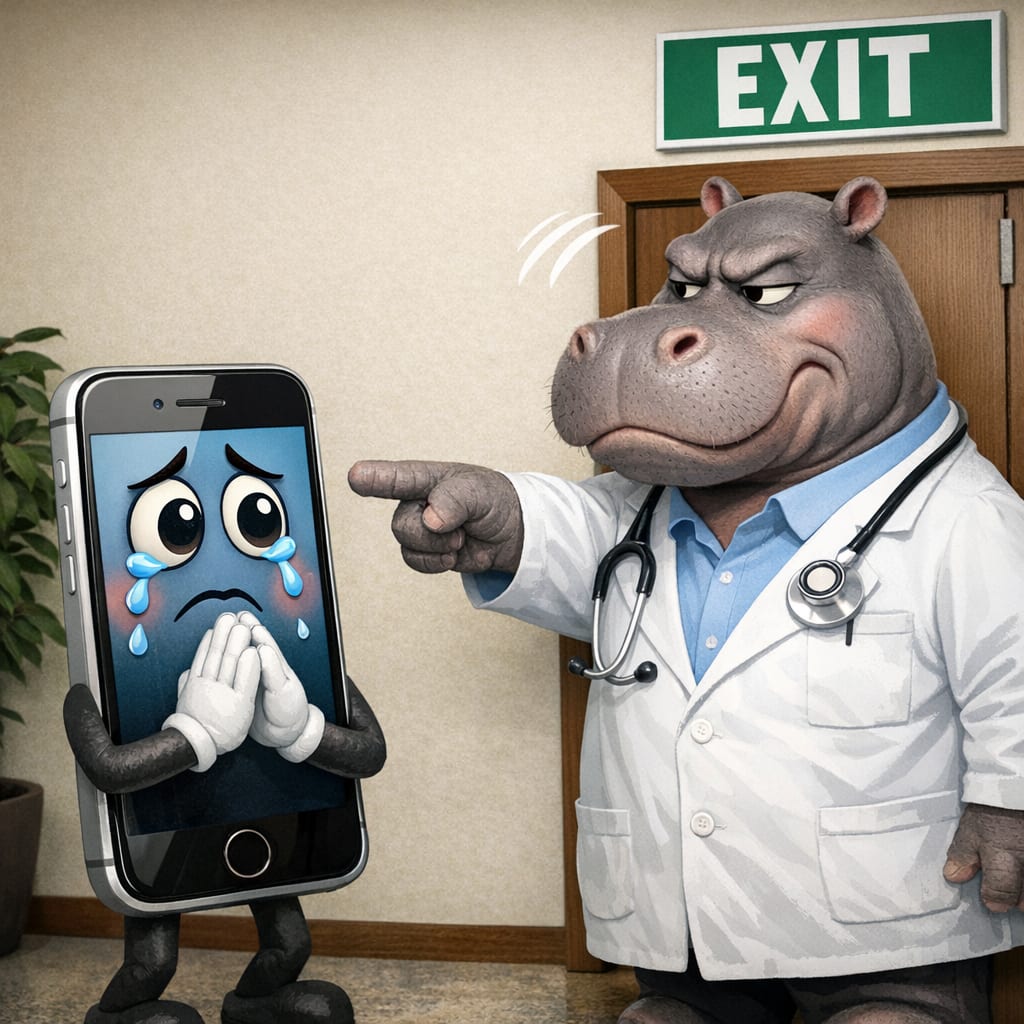 /showme Apple iPhone pleading with Hippo in white lab coat. Hippo is shaking his head no and pointing the iphone to a door labelled “Exit”.