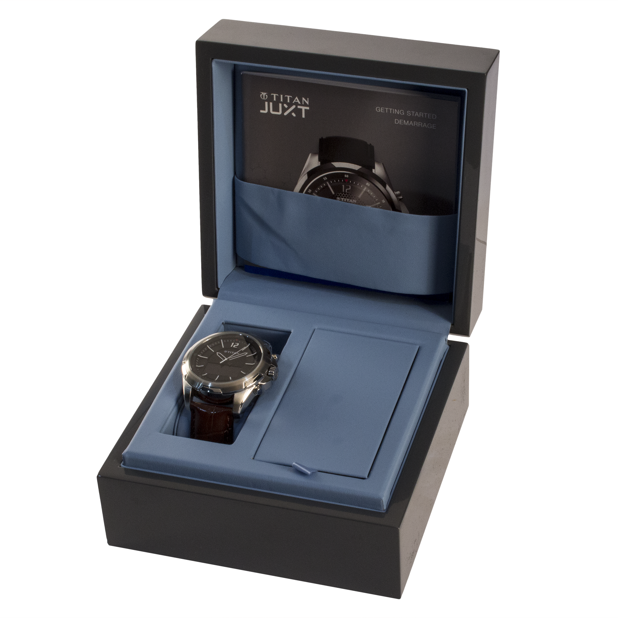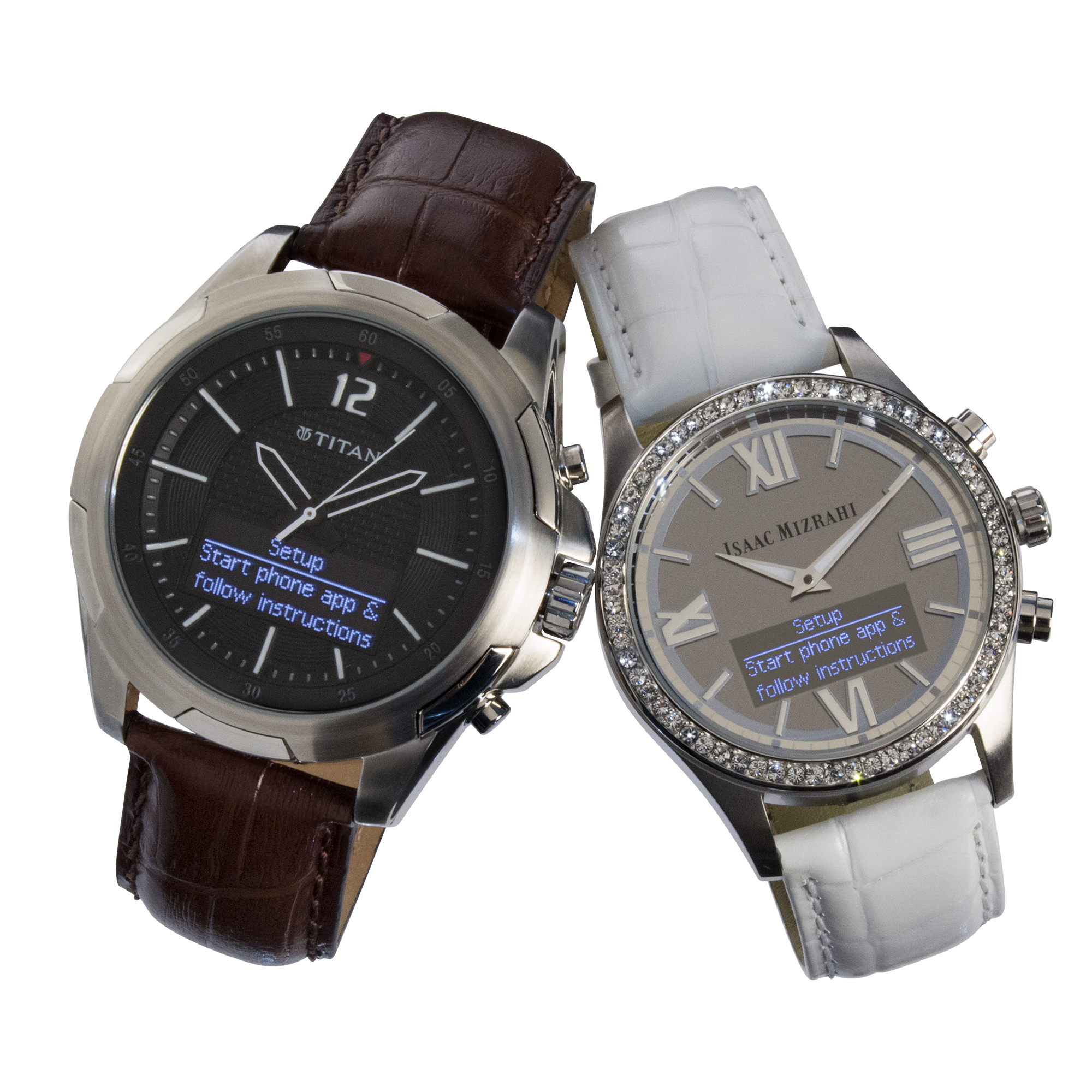Specs====- Model: 14517-001D - Condition: New- Displays notifications for calls, text messages, and calendar appointments- Color: Stainless Steel watch case, natural brown leather strap, Honeycombed patterned dial, OLED display- Water resistant 3 piece body construction- Honeycomb patterned dial with OLED display- Buttons: Two stylish Buttons to controls smart settings. Pusher to control the analog hands.- Battery: Rechargeable using clip on charger and USB port- Battery life: Up to 5 days- Wireless technology: Bluetooth- Compatibility: Apple and Android smartphones running Apple iOS 8 (or later) or Android 4.4 (or later)- Dimensions (Titan Juxt): 10.75 x 2.05 x 0.67 in- Dimensions (Misrahi): 9.64 x 1.89 x 0.55 in- Weight: .2 - 0.37 lb- User manual (titan)- User manual (MizrahiWhat’s in the Box?====1x Smartwatch1x Clip on chargerPictures====Ah look they’re buddies, you have to buy both nowLook how sad it is when they’re apartYou can try charging it with this cableOr putting it in a box"lalala I can’t hear you"but they’re both be sad"oh c’mon, get up""I’ll put you in a box too"So yeah, probably just buy as many as you canHey look it’s a parrotPrice Comparison====Titan:$59.99 (for used) at Amazon$250 ListMizrahi:$60.01 at Amazon$249.99 List