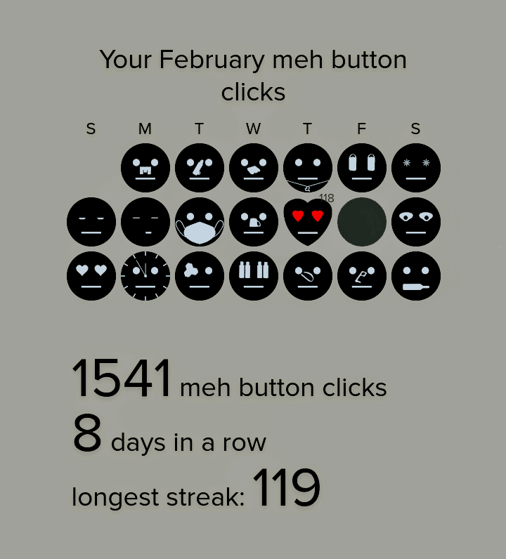 I know i’m not the only one who’s got a little thing going with the meh button clicks. Many of us come back day after day and click away! Well last week, out of the blue, my calendar of clicks disappeared! I was filled with ALL kinds of uncomfortable, icky feeling. Anger, sadness, guilt and discust. (Okay, I might have exaggerated just a bit with the feelings but I WAS bummed!) I couldn’t believe that I missed or forgot to click since I was “YET AGAIN” on the way to beating my pretty lame 119 day record. Yup, I had just noticed a few days prior that I was at my 89th day. Again! I even thought about quitting the whole thing, throwing in the towel on the insanity! After all, it’s not like there’s some sort of prize or a “Golden IRK” when we reach a certain number. Is there? Just had the thought that maybe it’s just another thing I haven’t yet learned, hmm…