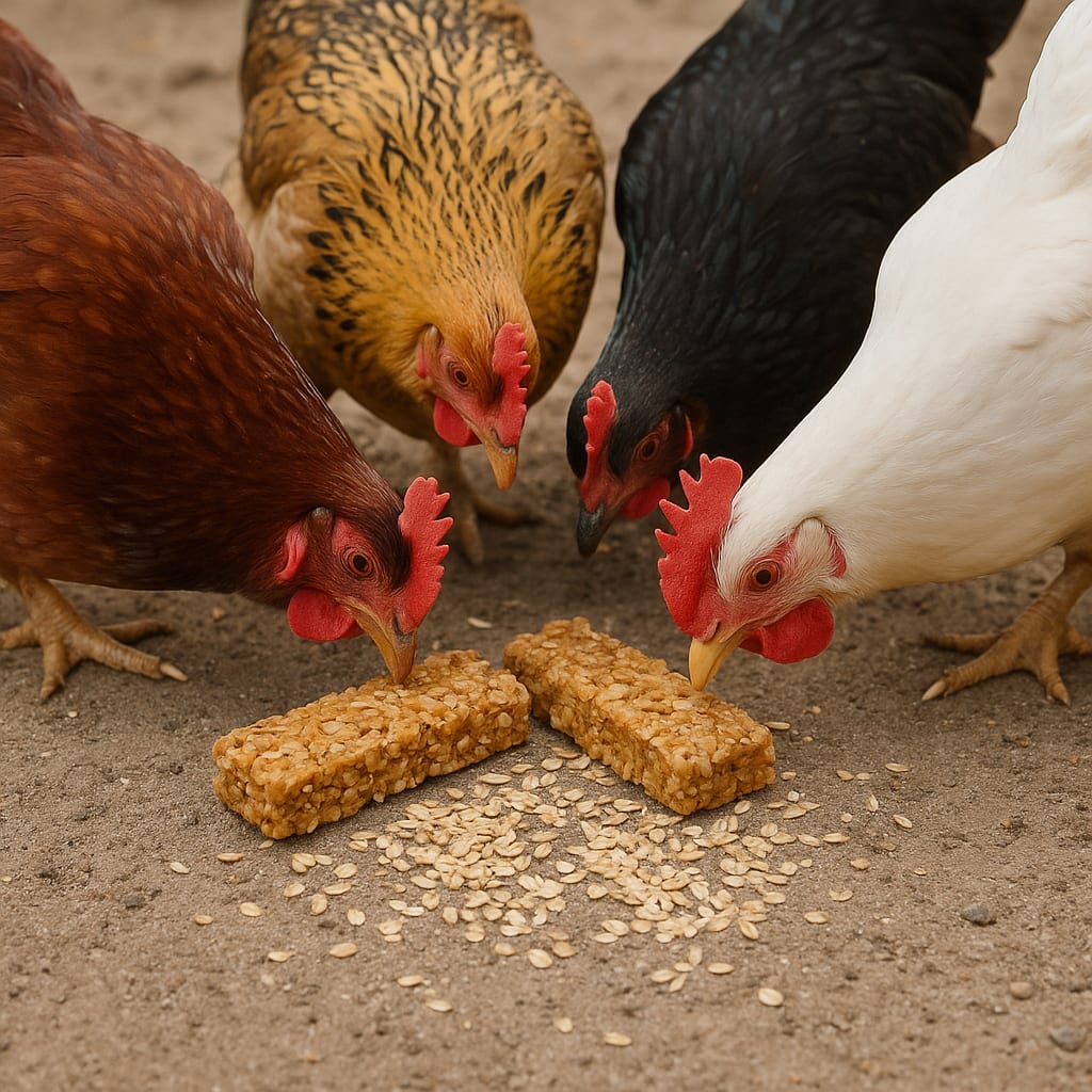 /showme chickens pecking at granola bars with loose oats on the ground beside them