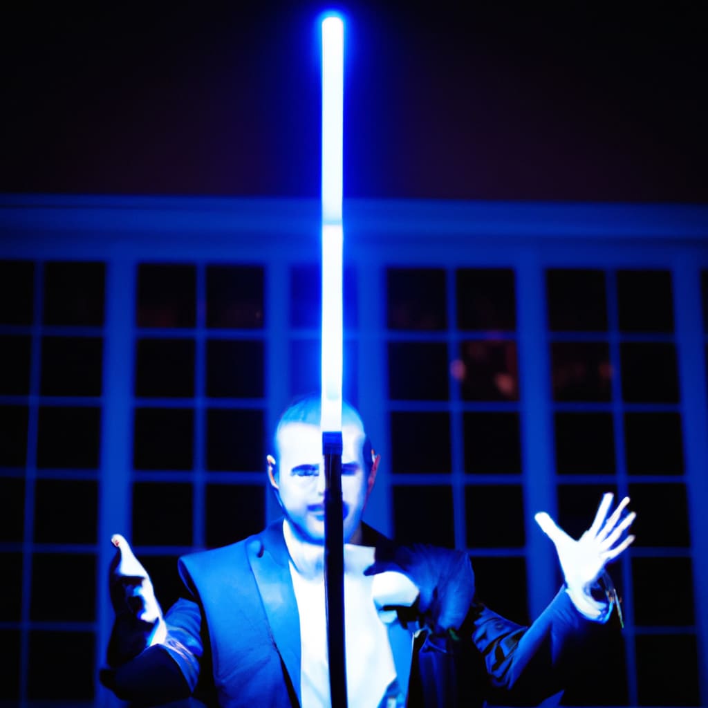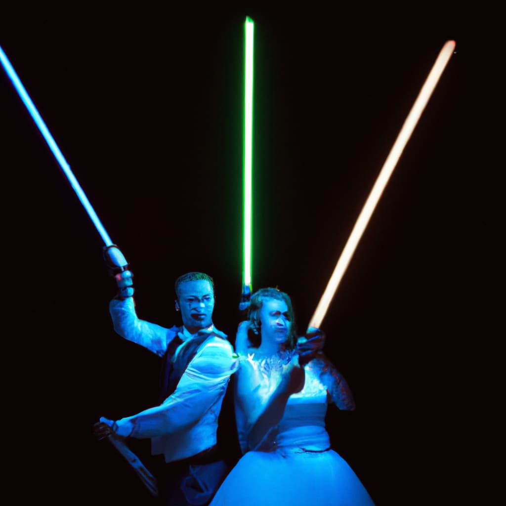 /showme wedding photo where the bride and groom are holding a lightsaber above their heads
