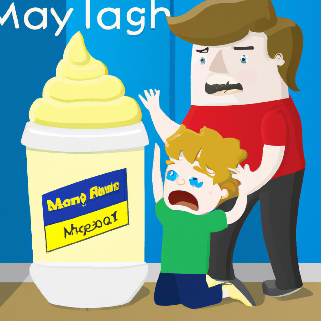 /showme kid crying because he is too weak to lift the heavy mayonnaise