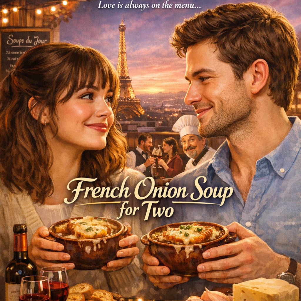 @KNmeh7 Here’s the image you requested for “romantic comedy of french onion soup”