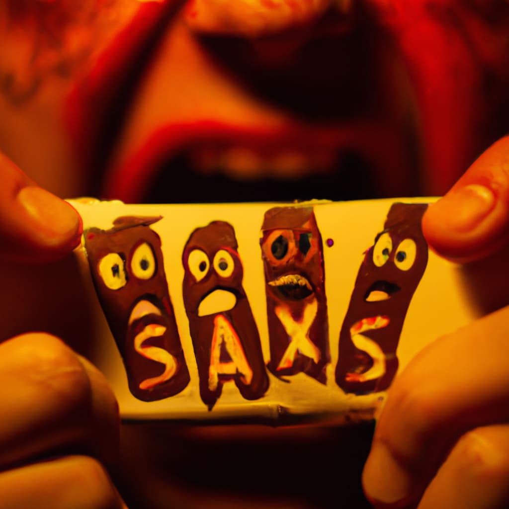 /showme a horror scene where anthropomorphic snack bars are in someone’s hands and screaming in terror.