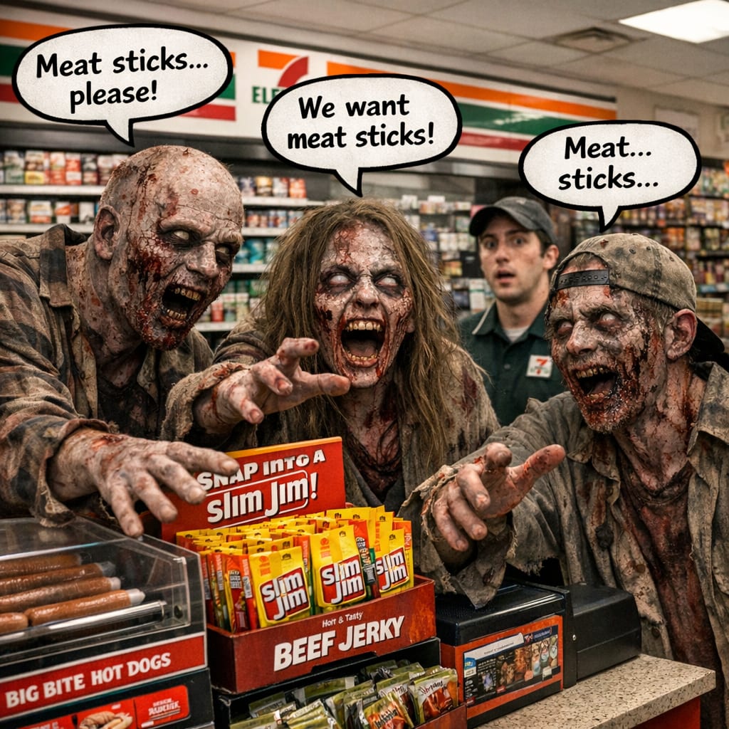 @cfg83 Here’s the image you requested for “Zombies asking for meat sticks in 7-11.”