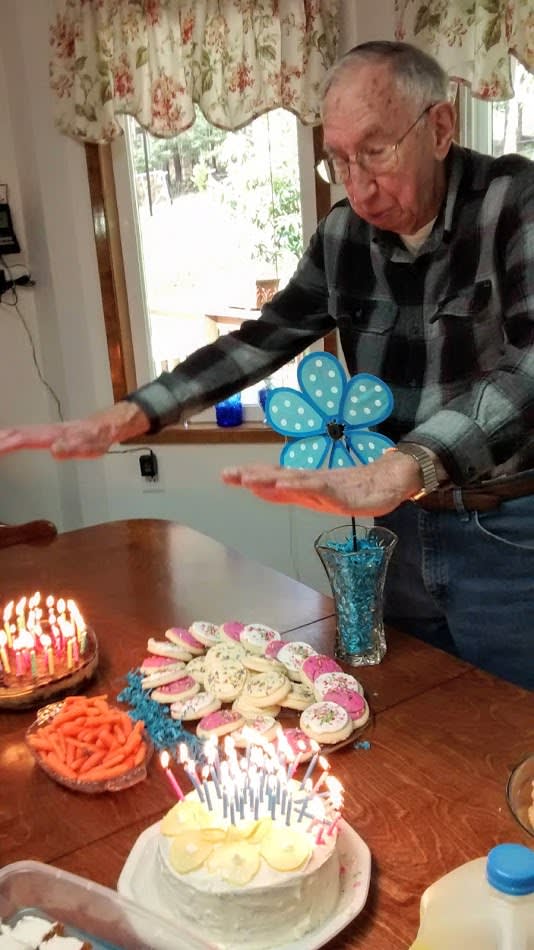 Photo from couple years ago of my wife’s stepdad warming his hands at his 90th - had to split the candles among two cakes. The guy still goes out and cuts wood on his acreage.