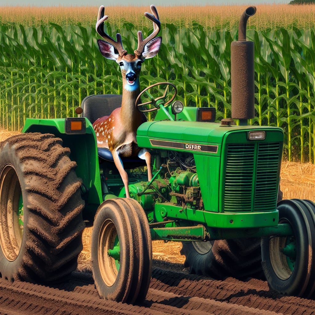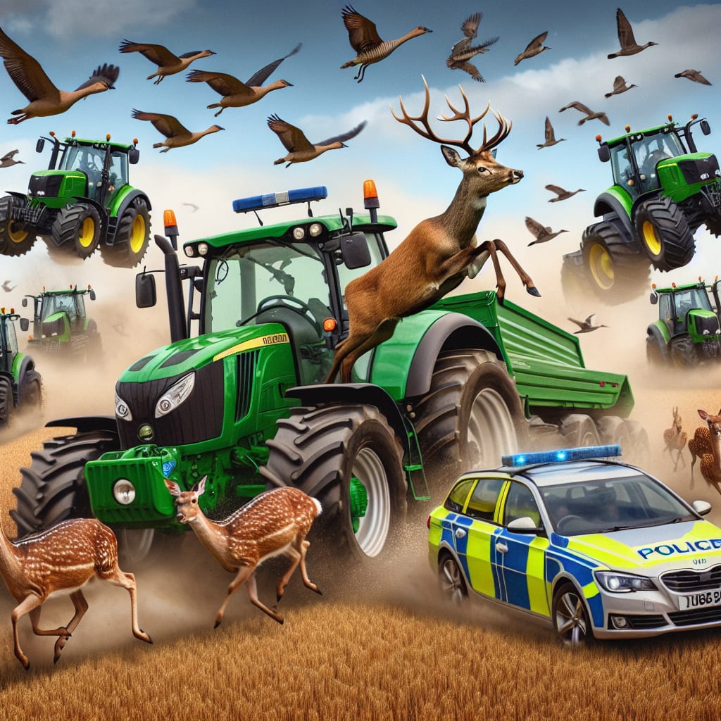 /showme a Deer in a John Deere tractor evading the police driving police tractors in a high speed chase.