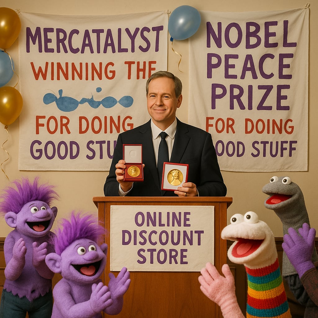 /showme Mercatalyst winning the nobel peace prize for “online discount store doing good stuff” in a mediocre ceremony with hand made banners and half deflated balloons. There should be purple trolls and sock puppets in the audience applauding wildly.