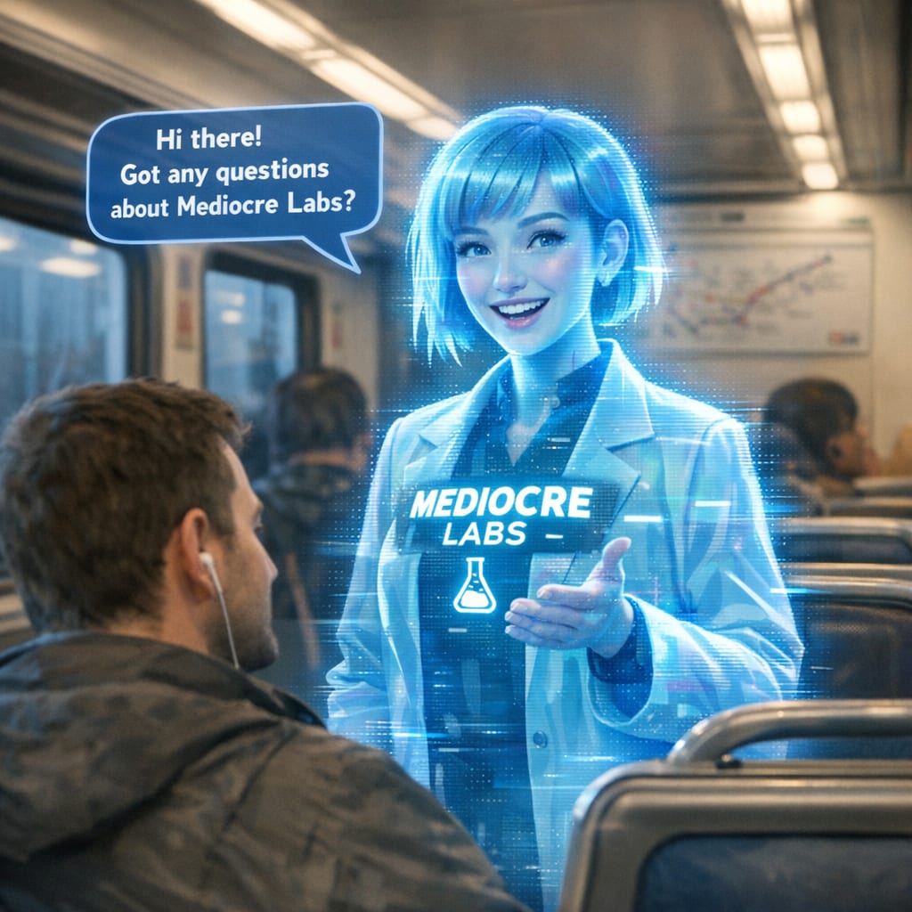 @chienfou Here’s the image you requested for “a holographic character who is actually an advertisement bot for mediocre labs, talking to someon…”