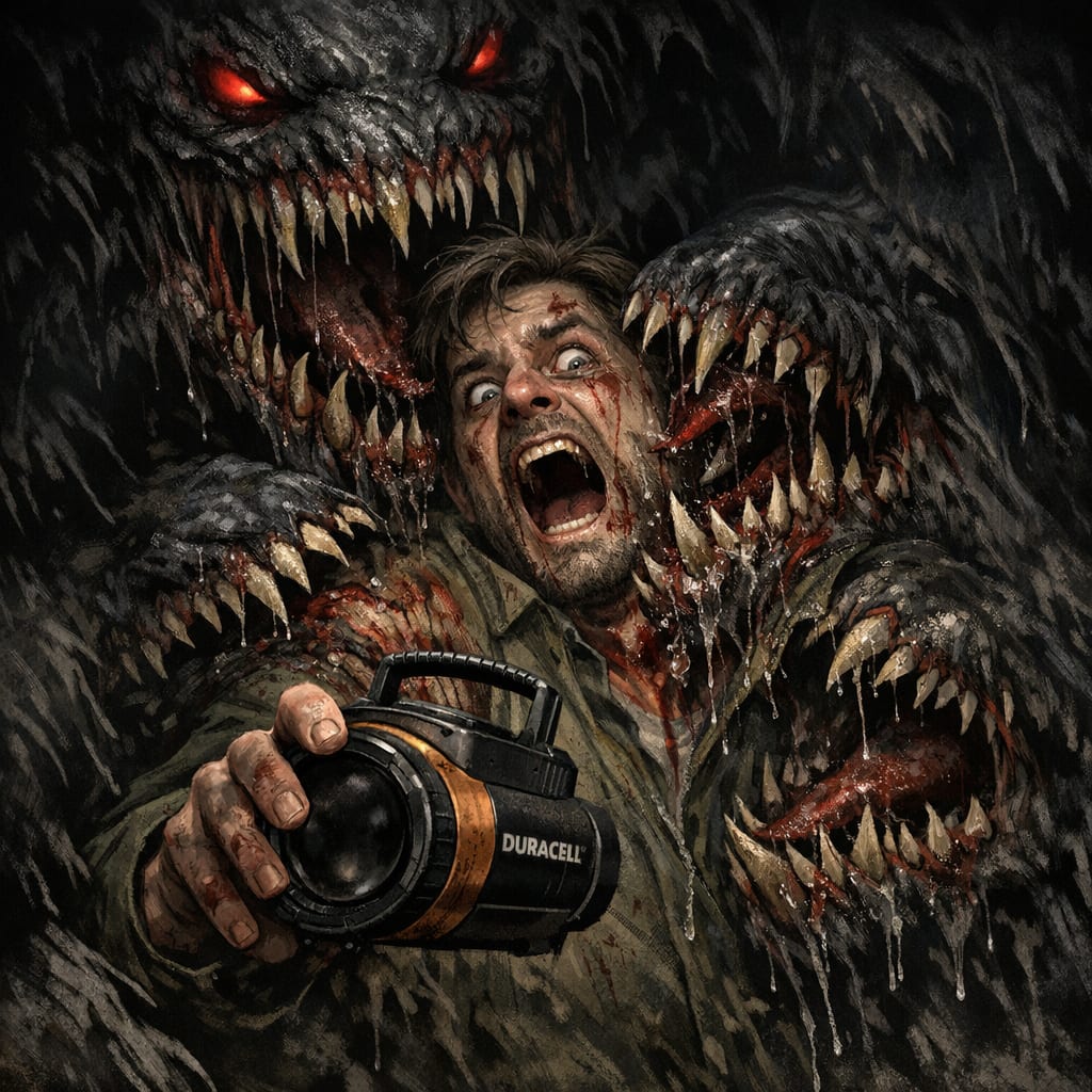 /showme man being consumed by the slavering fangs of a lurking grue because he didn’t charge his duracell lantern that he is holding