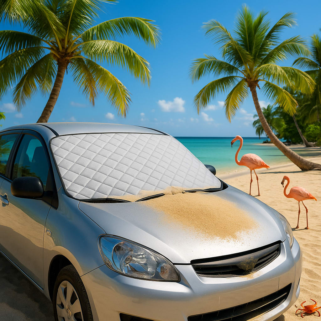 /showme a car with a snowshield on the windscreen keeping sand off the windscreen while the car is parked on a tropical beach with palm trees, flamingos and crap like that.