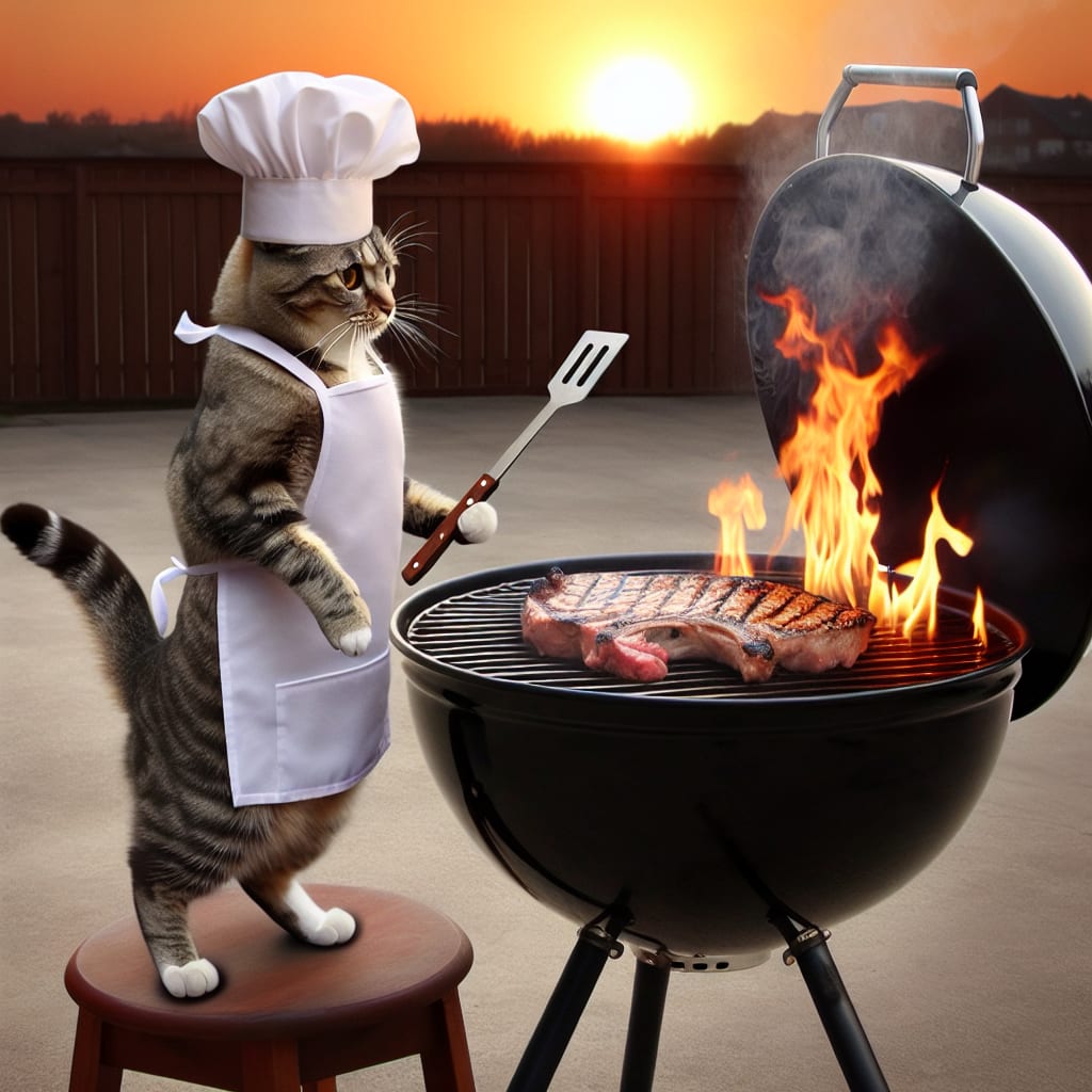 /showme a Cat grilling a steak well done