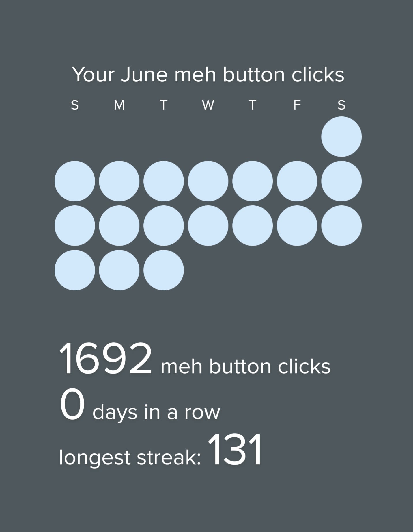 Huh. My current streak is ~10% of my total count.