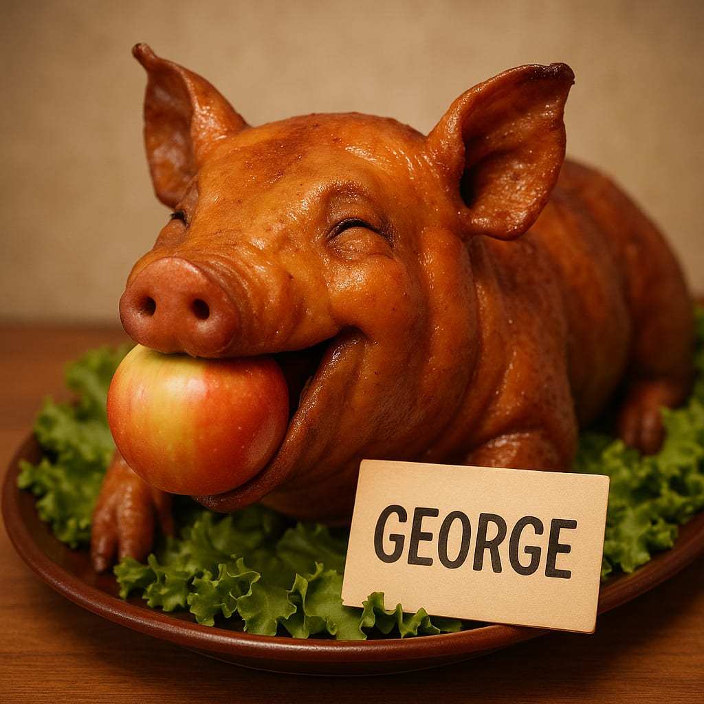 I remember a holiday meal at a cousin of my momās where they had a roast pig with an apple in its mouth. They kept referring to the pig as āGeorgeā.