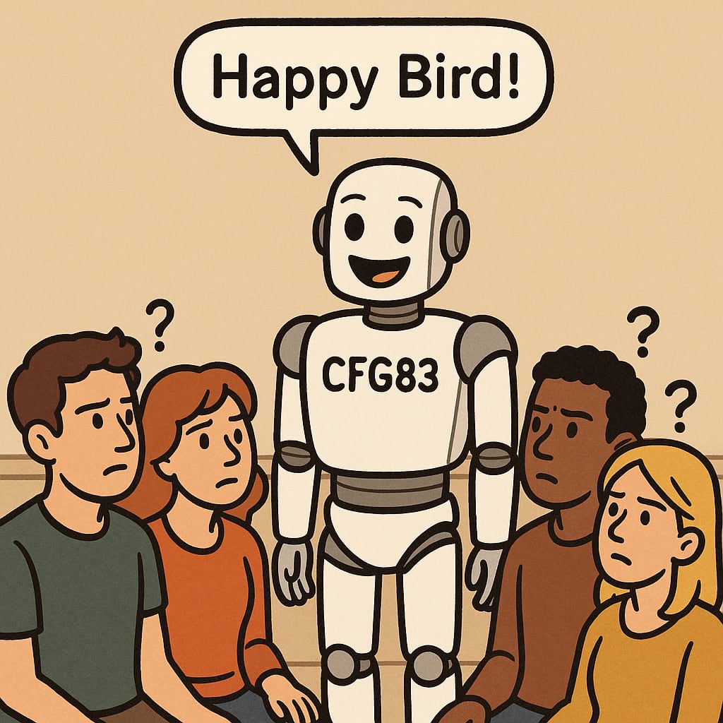 /showme four people sitting, two on each side of cfg83 who is standing up, looking at them with confusion as cfg83 smiles and says āHappy Bird!ā