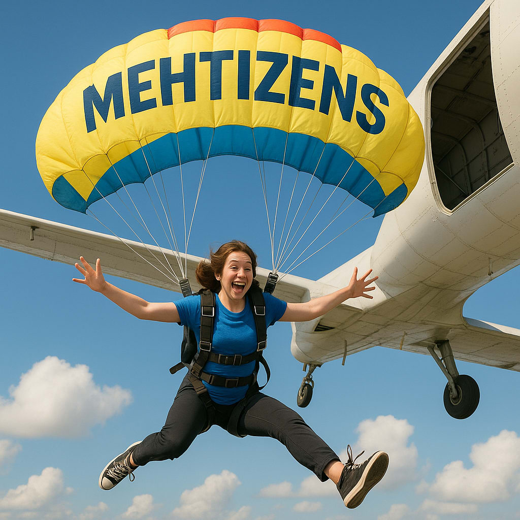 /showme a girl jumping off a plane with a parachute and with the word mehtizens on the parachute.