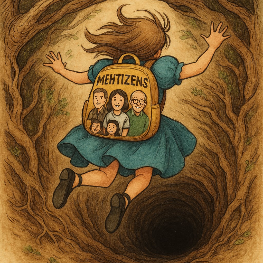 /Showme a girl jumping down a rabbit hole with people in the backpack that Iām wearing and with the word mehtizens on the backpack.