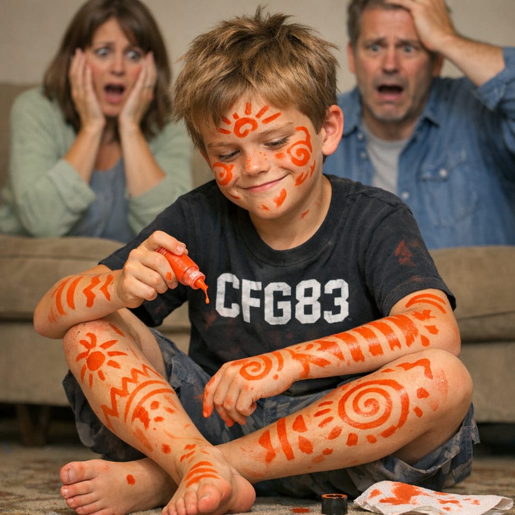 /showme stupid boy with shirt that says “cfg83” is using little bottle of red-orange liquid to paint patterns onto his arms, face, and legs. Parents are looking on with dread.