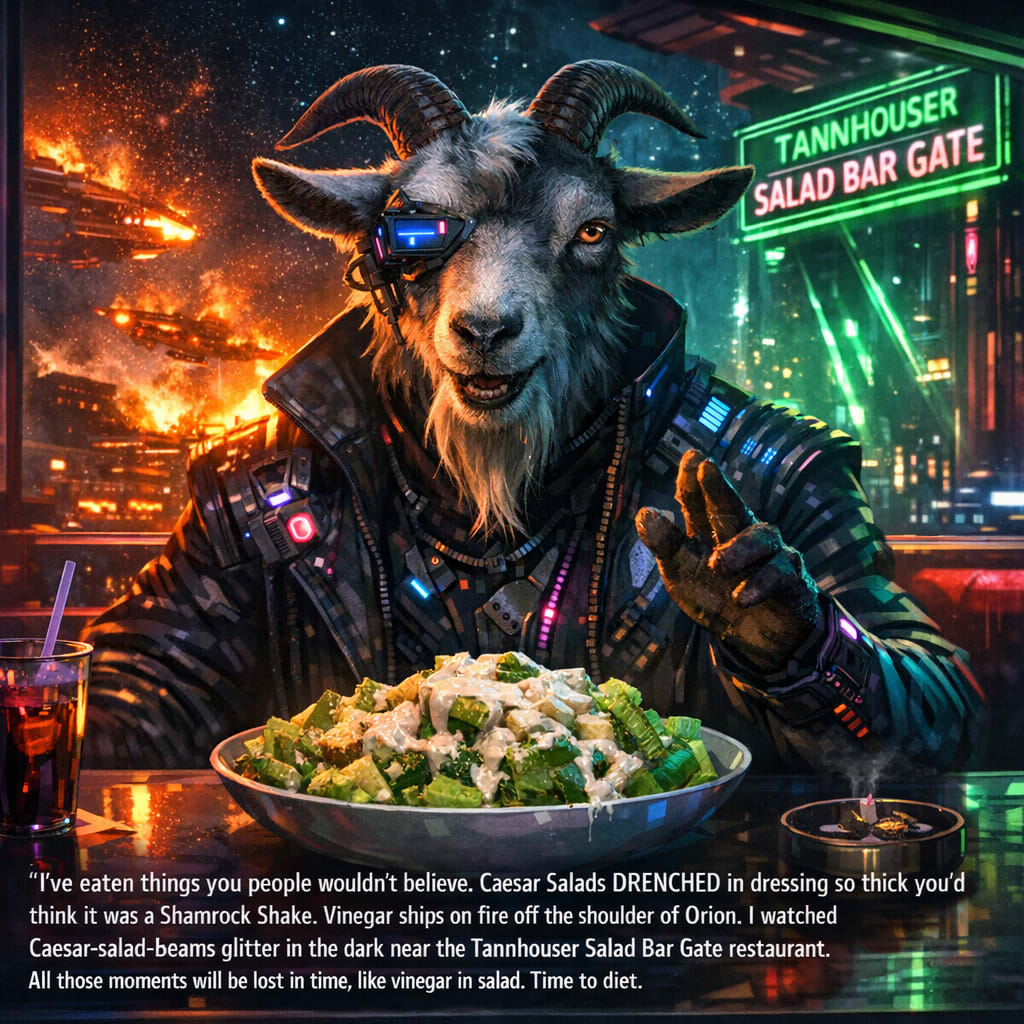 /showme Cyberpunk goat sitting at table with salad and saying “Ive eaten things you people wouldn’t believe. Caeser Salads DRENCHED in dressing so thick you’d think it was a Shamrock Shake. Vinegar ships on fire off the shoulder of Orion. I watched Caeser-salad-beams glitter in the dark near the Tannhouser Salad Bar Gate restaurant. All those moments will be lost in time, like vinegar in salad. Time to diet.”