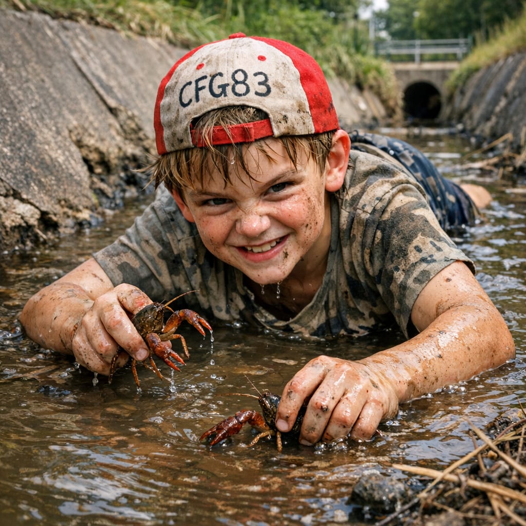 @cfg83 Here’s the image you requested for “Brat boy named cfg83 trying to catch crawdads with his bare hands in open drainage ditch.”