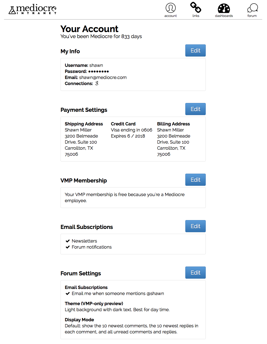 Like, really soon. Like, hopefully still this year soon. We need a way to set default payment settings and to allow our VMP members to change/update the credit card being used for their recurring payments without contacting our support team. All the settings and "fun little features and doohickies" @Preedom mentioned turned the current account settings page into a total disaster. So we're moving from this: