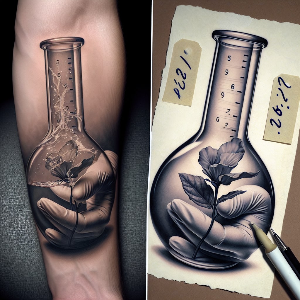 /showme a tattoo on my forearm showing a stylized Erlenmeyer flask with a crack in it and a paper showing today’s date, photorealistic