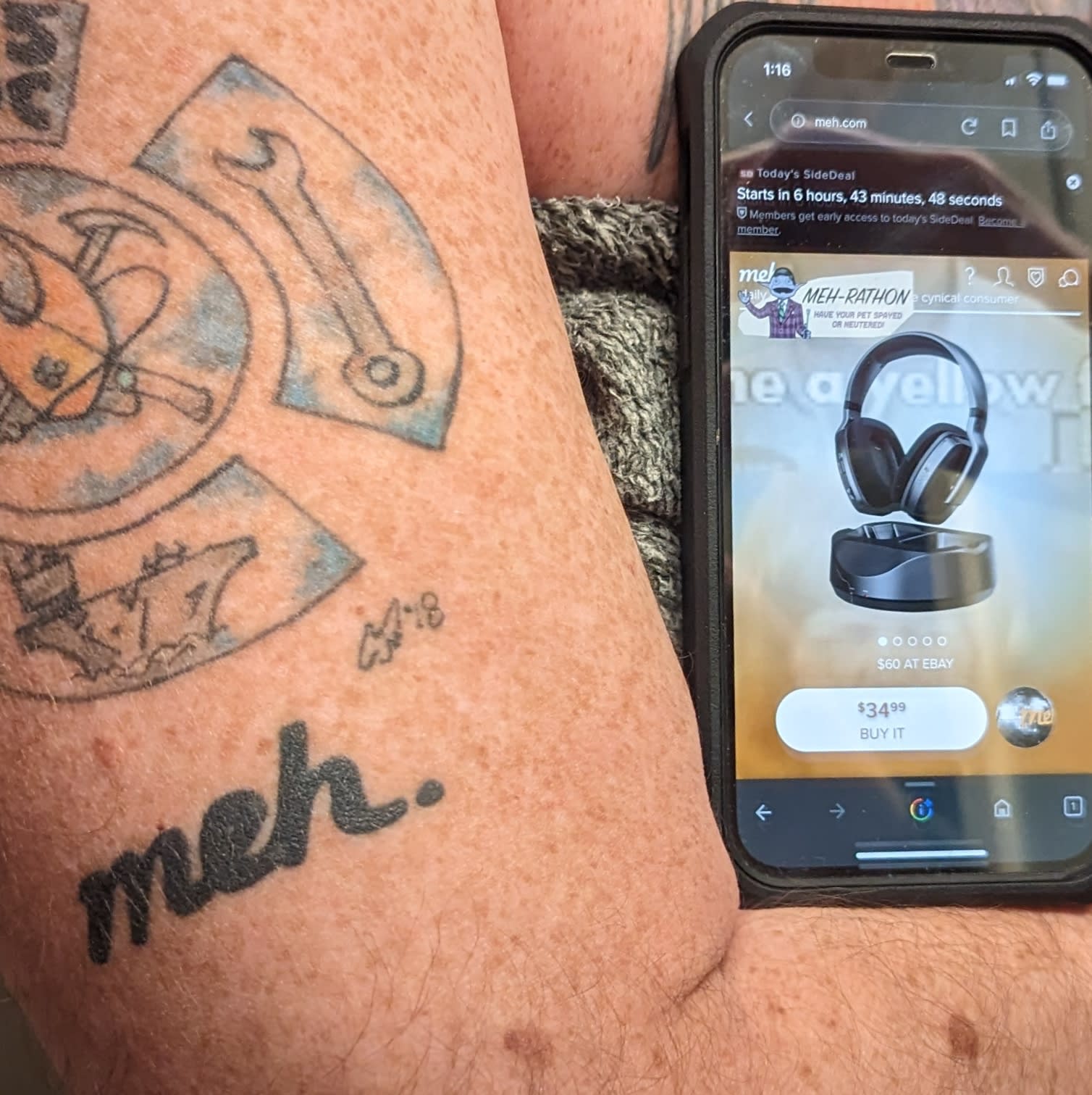 @ChadP Well, y’all are just gonna have to wait a bit before I’m willing to get that recarved (and spend the money, though really, the first Meh Tattoo IRK paid for the tattoo)
