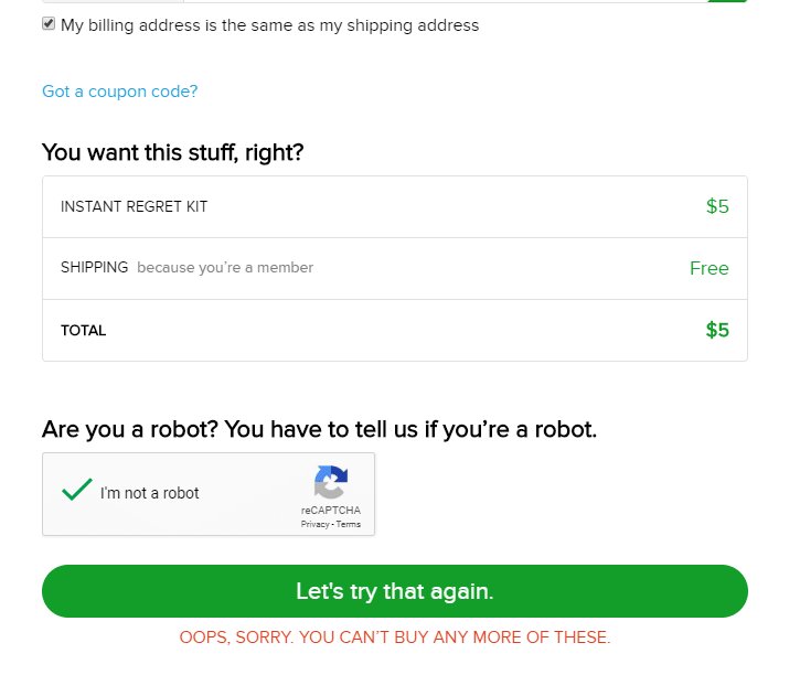 Not that I really WANT a box of junk, but I just watched my “order” run through 12 times (the green bar at the bottom) before it showed as “sold out.” Twelve times! That is just not right.