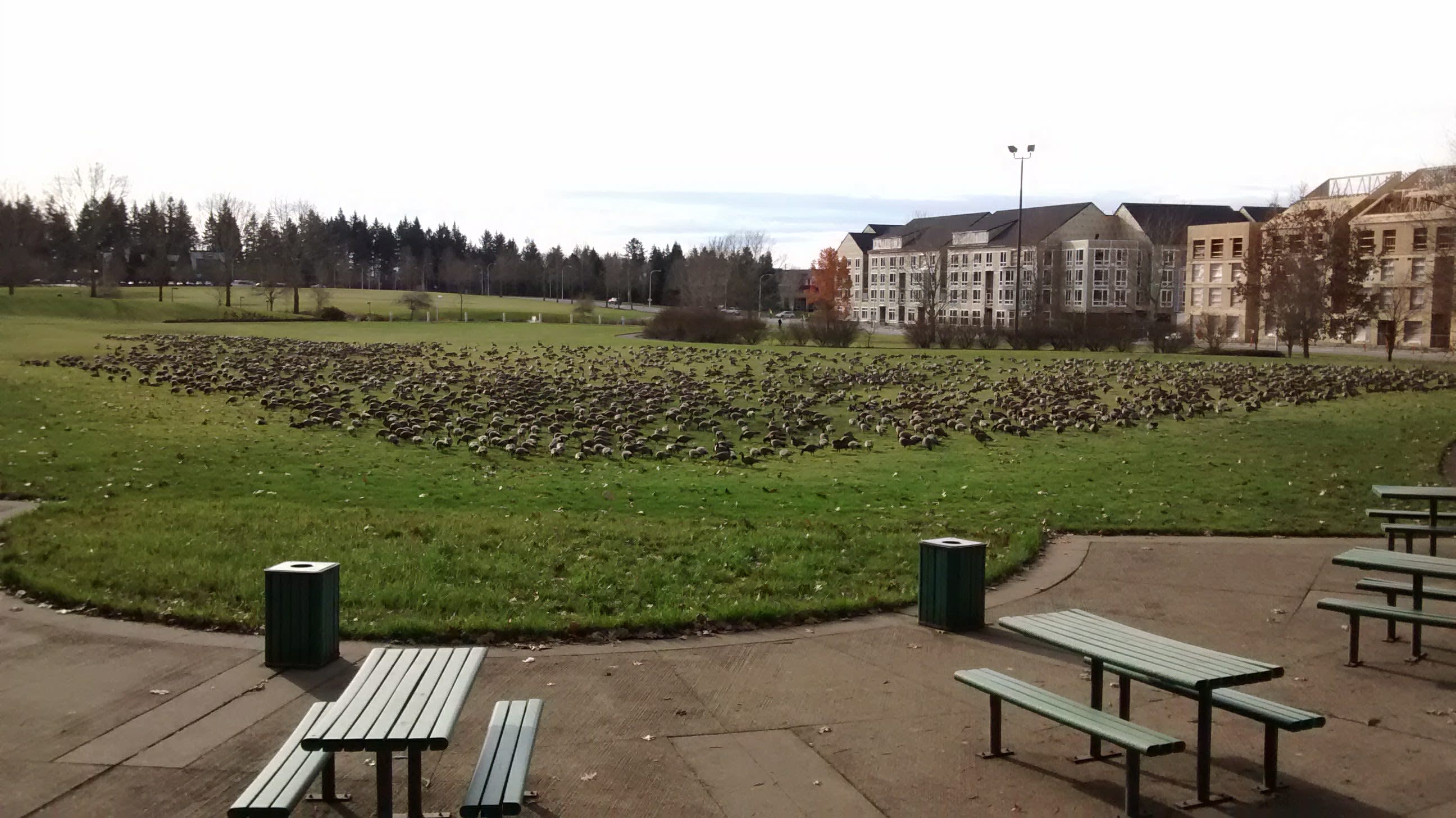 @Kidsandliz @lisagd @PHRoG @werehatrack At the park in the photo above, there was (all too often) a small child or dog who would take delight in running toward the flock on the ground, causing hundreds of them to take to the air. Trust me, you would rather have that many geese on the ground than in the air over your head!